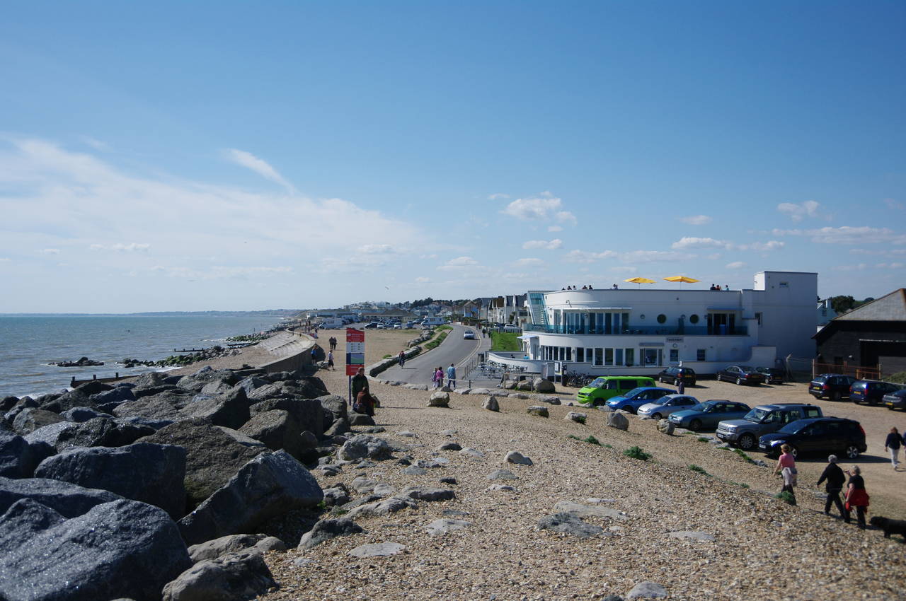 A few minutes walk further west, the path leaves the woods and passes a Maritime and Coastguard Agency training centre before descending through a wooden gate to the beach below Friar's Cliff (picture 17). The path heads between two rows of colourful beach huts to a café, then follows the beachside promenade in front of the beach huts.