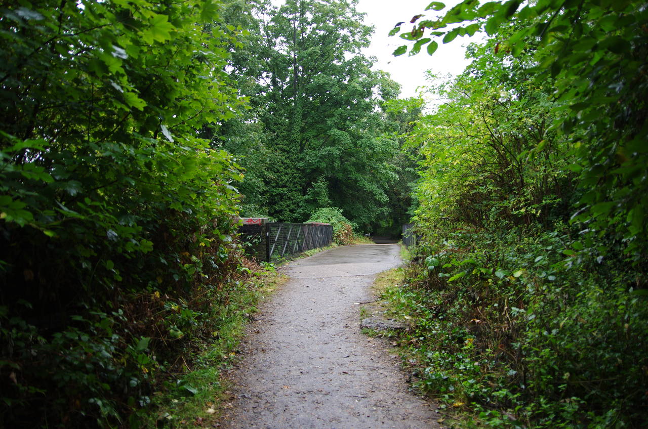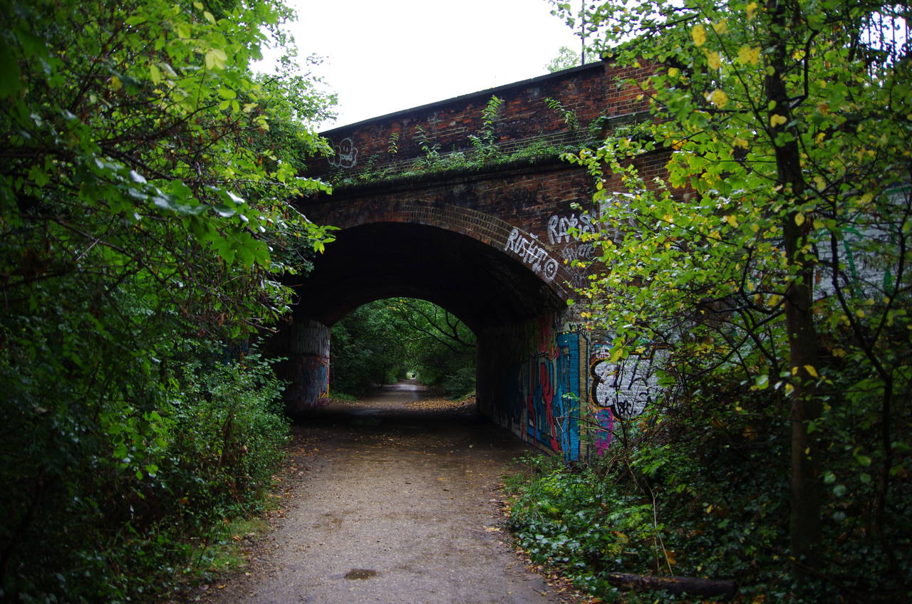 A short distance to the left of the entrance, one can see the opening of a tunnel that took the line under Highgate Hill (picture 3), but the Capital Ring turns right to follow the trackbed in the direction of Finsbury Park, almost three kilometres away. Every now and then the long stretch of greenery is broken by a former railway bridge carrying the path over urban streets (picture 4).