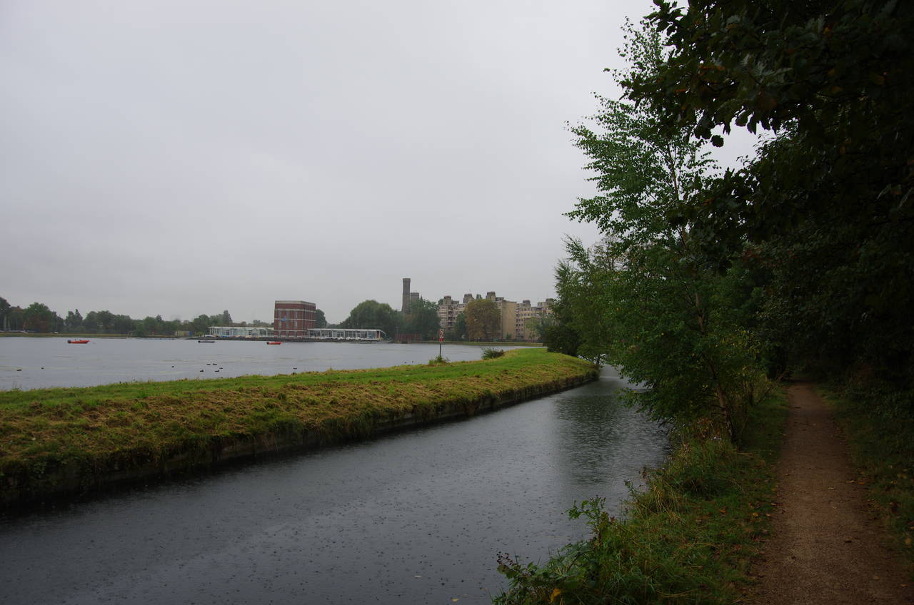For the next 700 metres the Capital Ring follows the right bank of the New River by the back fence of a large council housing estate. On reaching the A503 Seven Sisters Road, the route uses a pedestrian crossing to the left before rejoining the New River, which soon bends around to the right to run beside the East Reservoir at Stoke Newington. As I headed along this section of the path it began to rain (picture 12) and by the time I reached Woodberry Grove, which separates the East Reservoir from the larger West Reservoir, it was coming down quite heavily and I decided to take shelter at a new apartment building next to the New River on the other side of the road.