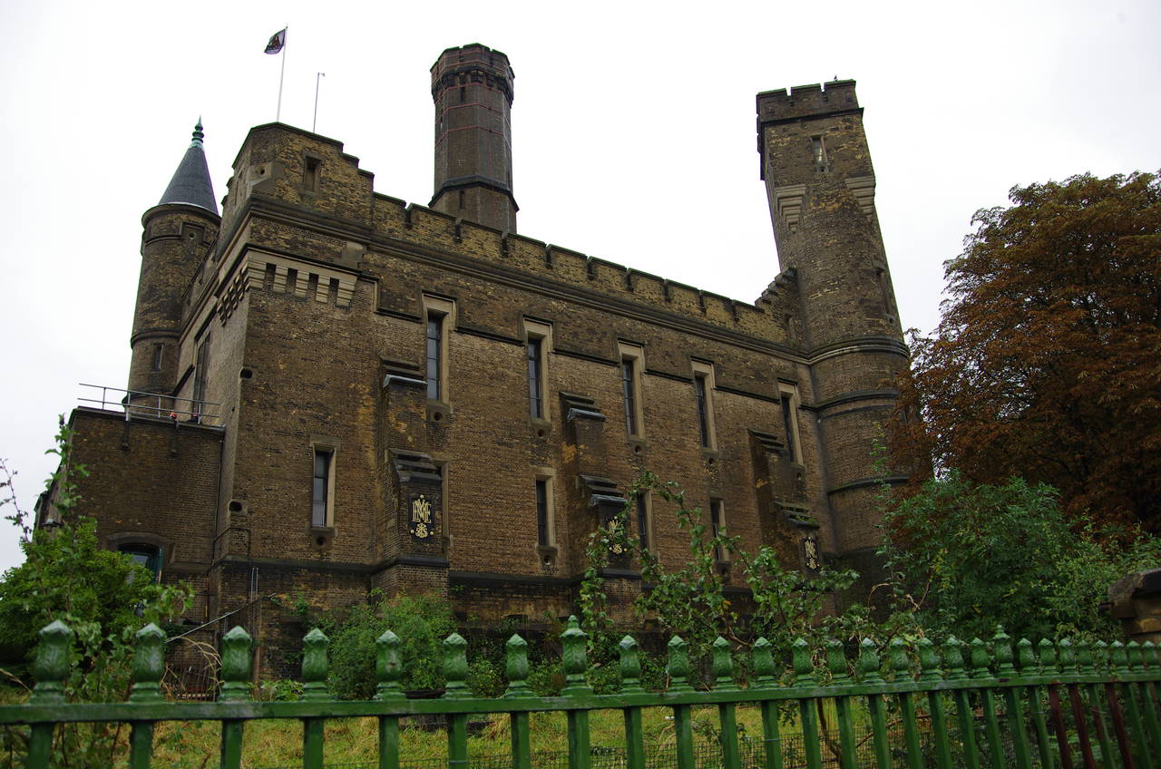 Near the end of the river a footbridge crosses over to the access road of the West Reservoir's sailing club and the Capital Ring follows the road to the right to a main signpost where the path turns left, joining the A105 Green Lanes for a second time. By the corner stands The Castle (picture 14), built in 1855 as another one of London's grand Victorian pumping stations, though it has since been turned into an indoor rock climbing centre.