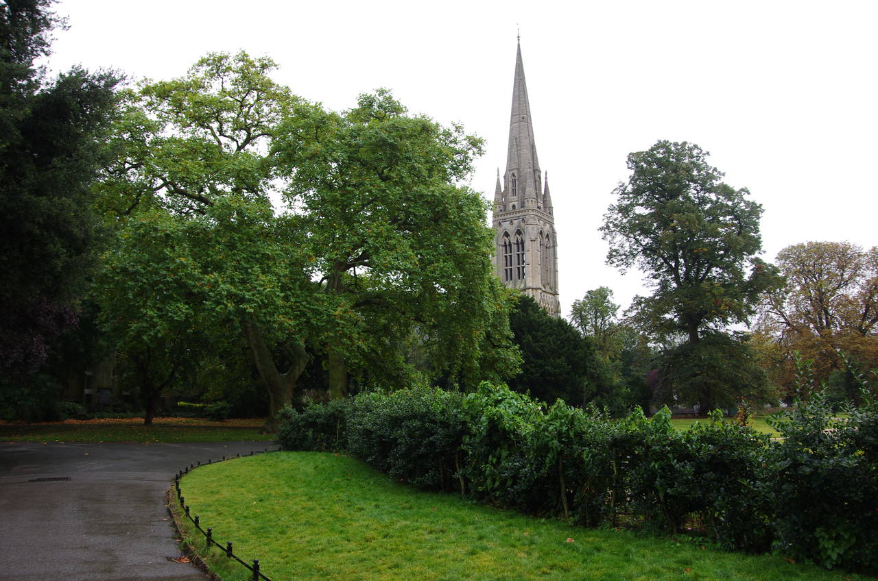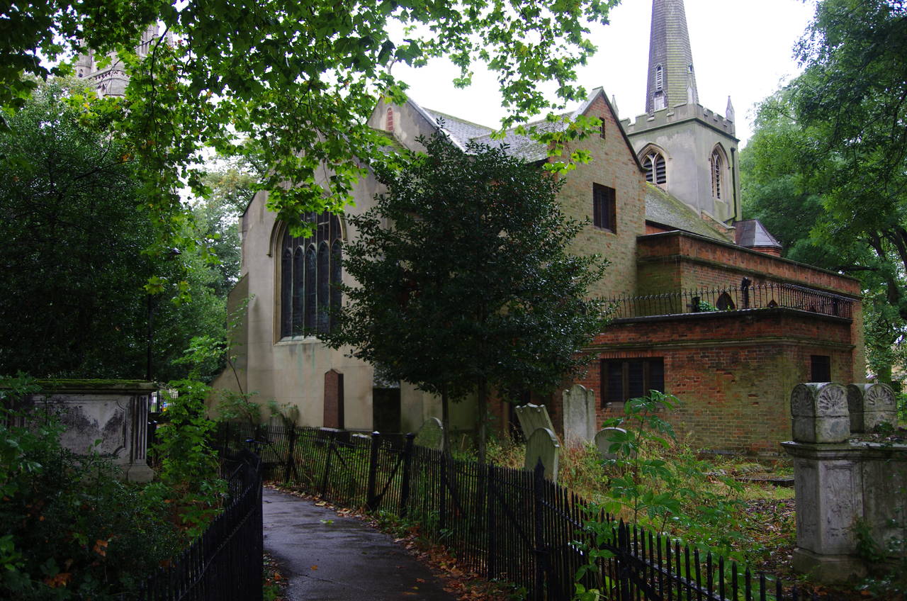 Heading around to the left of the house, the path has another good view of the 65 metre high spire of St Mary's (picture 17) before passing by its much smaller 16th-century predecessor, the Ancient Mother Church, hidden among the trees (picture 18). A fenced path through the old graveyard leads out to B104 Stoke Newington Church Street, opposite St Mary's. At a little over 6 kilometres from Trafalgar Square, this is the closest point of the Capital Ring to the centre of London.