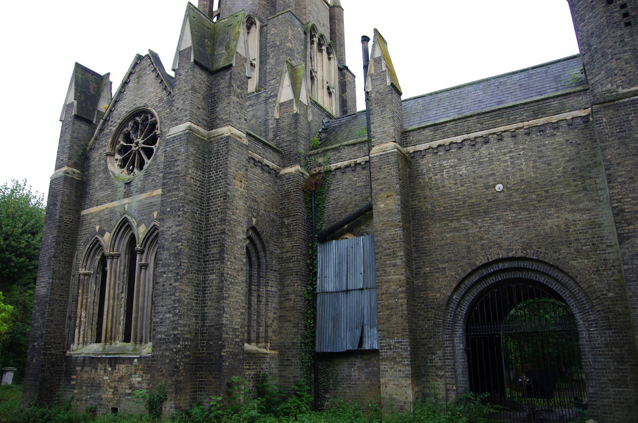 The Capital Ring follows narrow paths among the closely-packed graves to reach the disused chapel in the centre of the cemetery (picture 20). Among the notable graves passed on the way is that of William and Catherine Booth, who founded the Salvation Army in 1865. Turning right to pass the chapel, the Capital Ring follows a broader path out to the cemetery's main gate beside the A10 Stamford Hill.