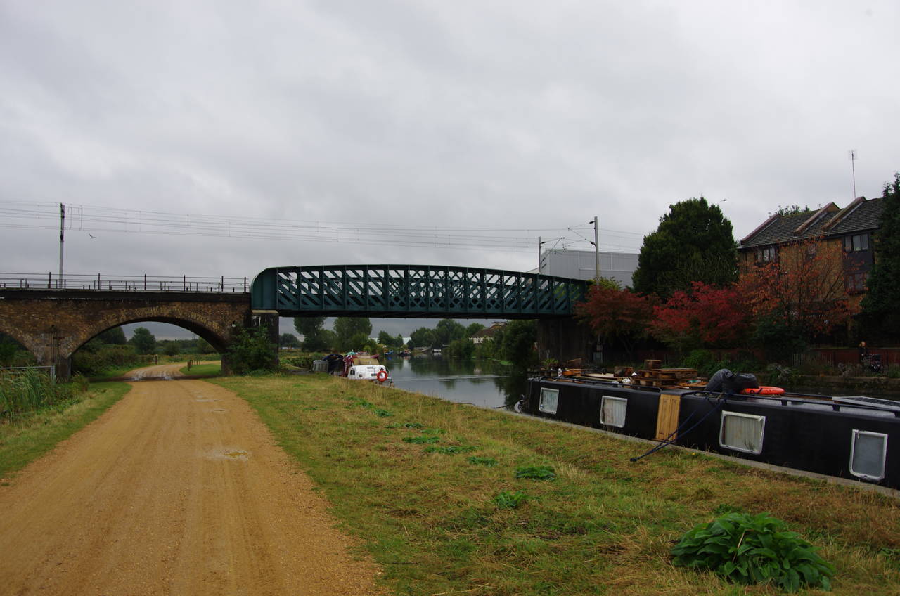 A few metres further, the Greenway bends slightly left, crossing a bridge over Channelsea, one of several minor channels of the River Lea that are collectively known as the Bow Back Rivers. Ahead, the path crosses Canning Road at ground level before taking a bridge over the tube's Jubilee Line, then a few hundred metres further, the Greenway bears right to cross over the tube's District Line.