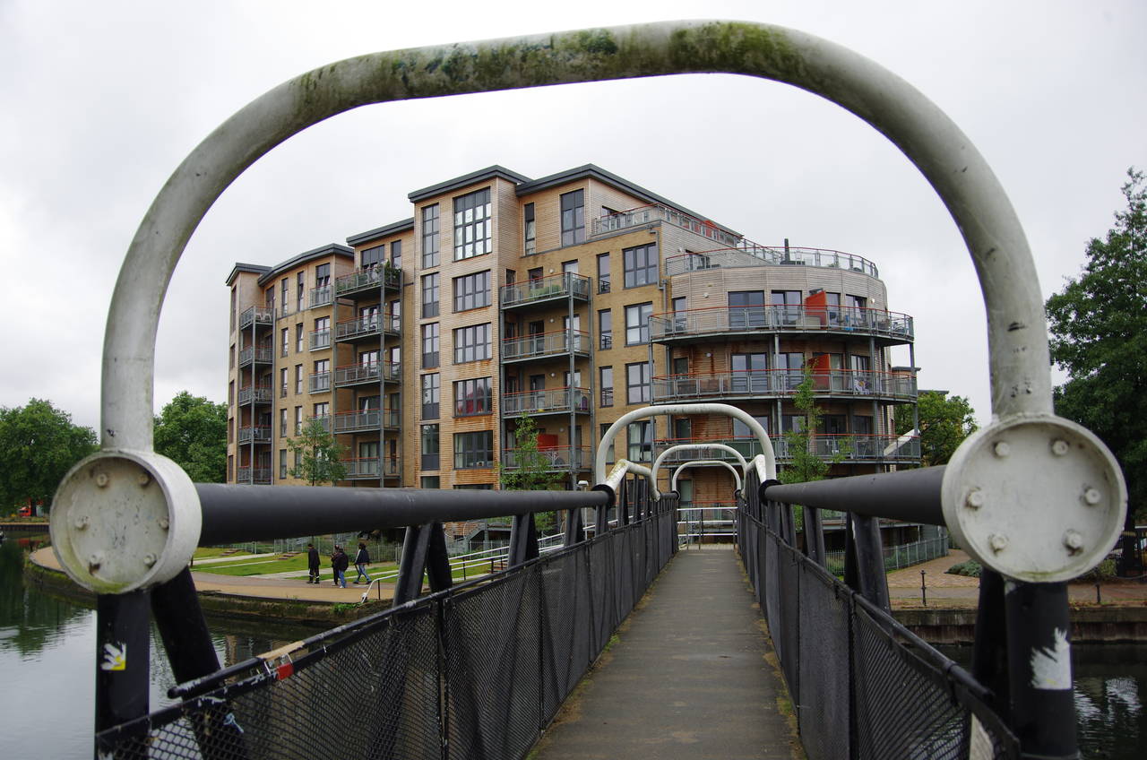 The Capital Ring continues a little further along the bank of the Lee Navigation before crossing over the Curtain Gate Bridge to Hackney Marsh, which occupies the island between the river and the man-made canal of the Lee Navigation.