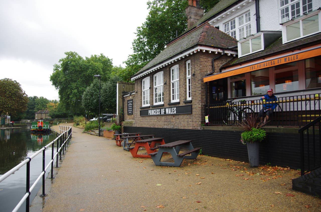 Around a bend in the river the path passes under Lea Bridge and along the terrace of the Princess of Wales pub (picture 27). Across the water, the River Lea leaves the Lee Navigation for a while, flowing over a weir.