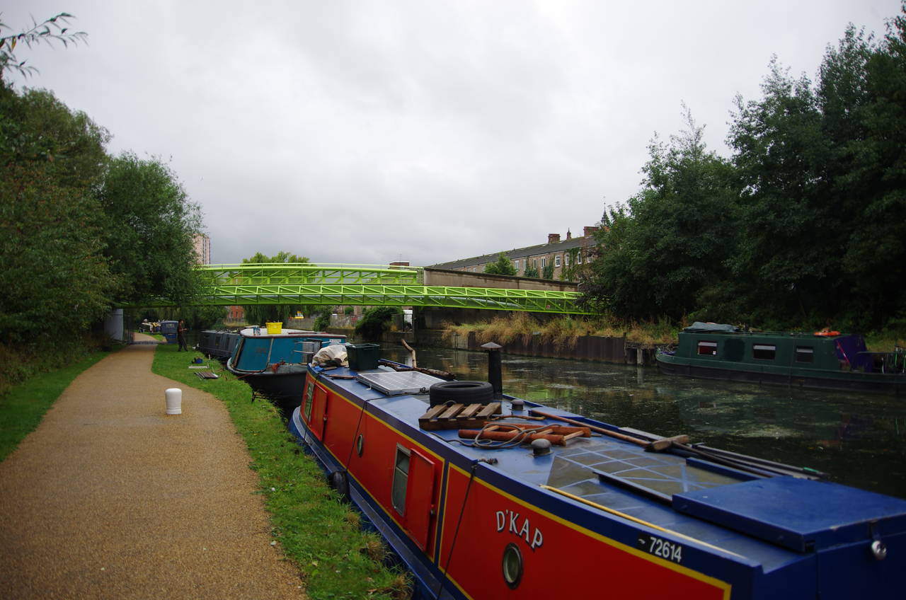The Capital Ring follows the towpath down the left bank of the navigation, where a number of narrowboats were moored near a brightly coloured bridge that carries pipes across the canal (picture 28).