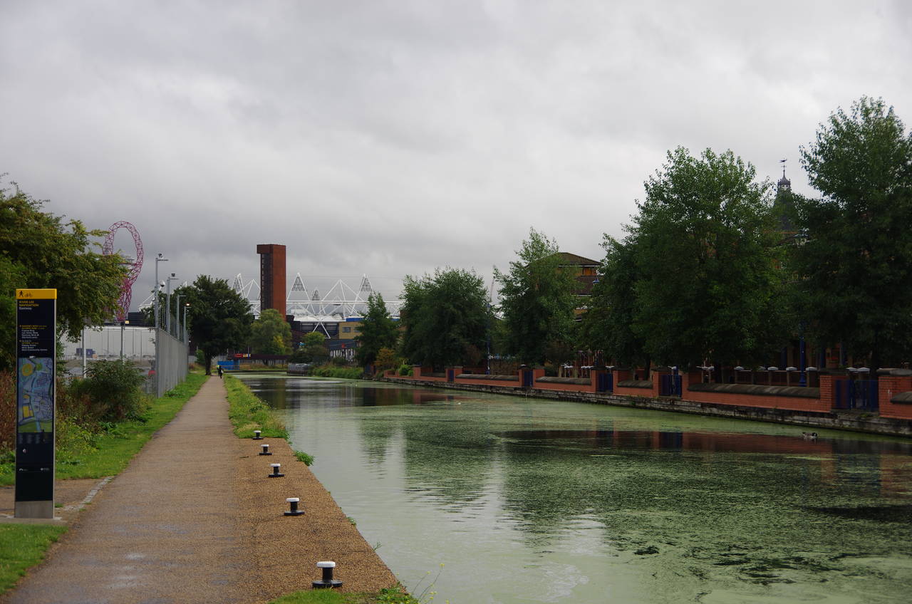 After following the Lee Navigation by Hackney Marsh (picture 29) for about two kilometres, the towpath passes under the A12 and reaches the London Olympic Park next to the Press Centre, though the main stadium is still quite some distance ahead (picture 30). The games had ended a few weeks before I did this walk, so the area was rather quiet.