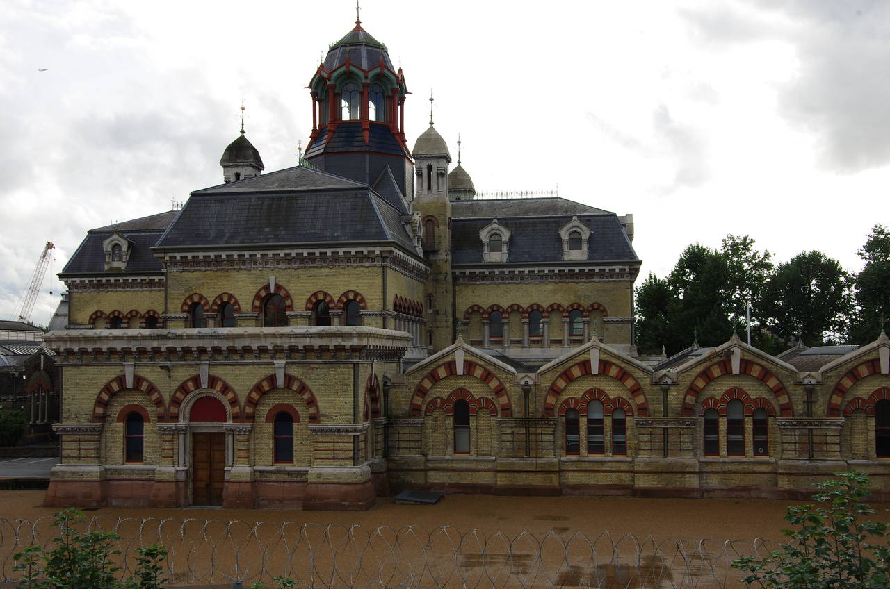 About 500 metres along this straight stretch of path, the Capital Ring crosses the Greenwich Meridian in front of the Abbey Mills Pumping Station (picture 33), the third of the fancy Victorian-era sewage pumping stations on the route. This one operated from 1868 until 1997, until being replaced by a new facility just behind the original, and is still known to many locals as The Temple of Sewage.