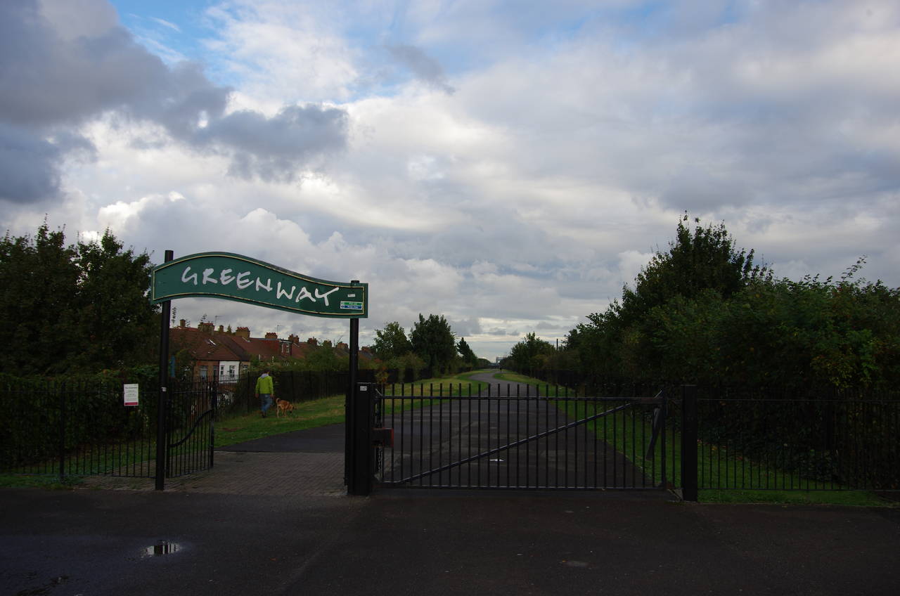About 100 metres further along the towpath, the route of the Capital Ring turns left at a main signpost just after passing under a bridge, leaving the Lee Navigation and the Lea Valley Walk after sharing routes for almost five kilometres. At the top of a ramp, the route joins the Greenway -- a walking and cycling path that runs along the top of the 10 kilometre long Northern Outfall Sewage Embankment (with the ironic acronym NOSE), which carries around half a billion litres of waste to Beckton for treatment every day.