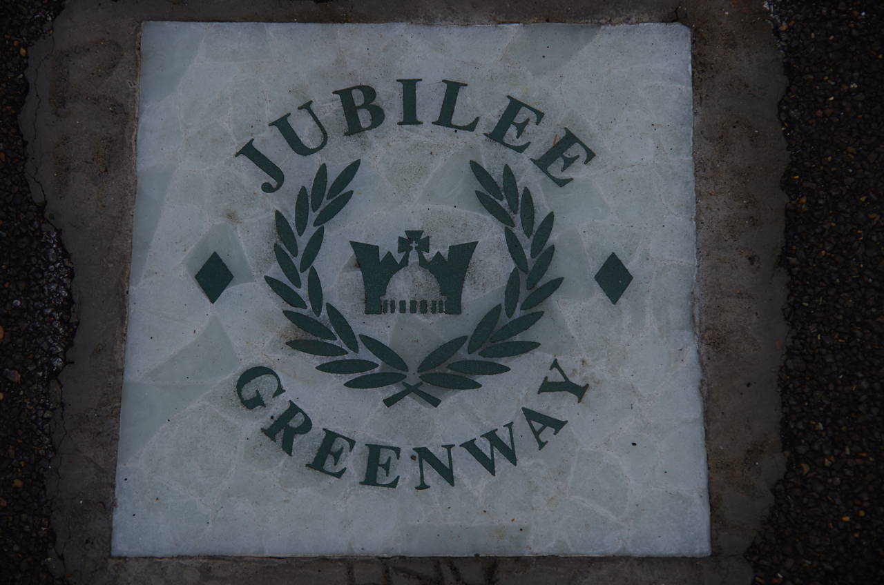 From here the Capital Ring follows the Greenway straight ahead for around three kilometres of easy, uneventful walking with the surrounding suburbs of West Ham and Plaistow largely hidden from view behind the summer foliage lining much of the path. The peaceful monotony is only broken by five road crossings, marked by metal gates and banners, the last being across Boundary Lane (picture 34). Embedded in the surface from time to time are tiles marking the Greenway as part of the longer Jubilee Greenway (picture 35), a 60 kilometre circular path linking Buckingham Palace in central London with various Olympic venues in London's east. I have noticed a few of those tiles in various places around London since the Jubilee Greenway was opened in 2009, including on the first few kilometres of the Capital Ring between Woolwich and Charlton.