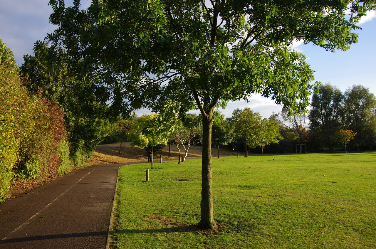 On the far side of the park, the route turns right to skirt around the edge of the park inside a narrow strip of trees with houses to the left and playing fields to the right. On reaching a path junction in the north-east corner of the park, the route bears left between houses to cross Harper Road and continue ahead on Savage Gardens alongside the playing fields of New Beckton Park. At the next corner of the park, the route turns right on a path along the next side of the park. When the path comes up to houses, it turns left beside them for about 100 metres before bearing right to follow the short Learoyd Gardens out to East Ham Manor Way, where the route turns right.