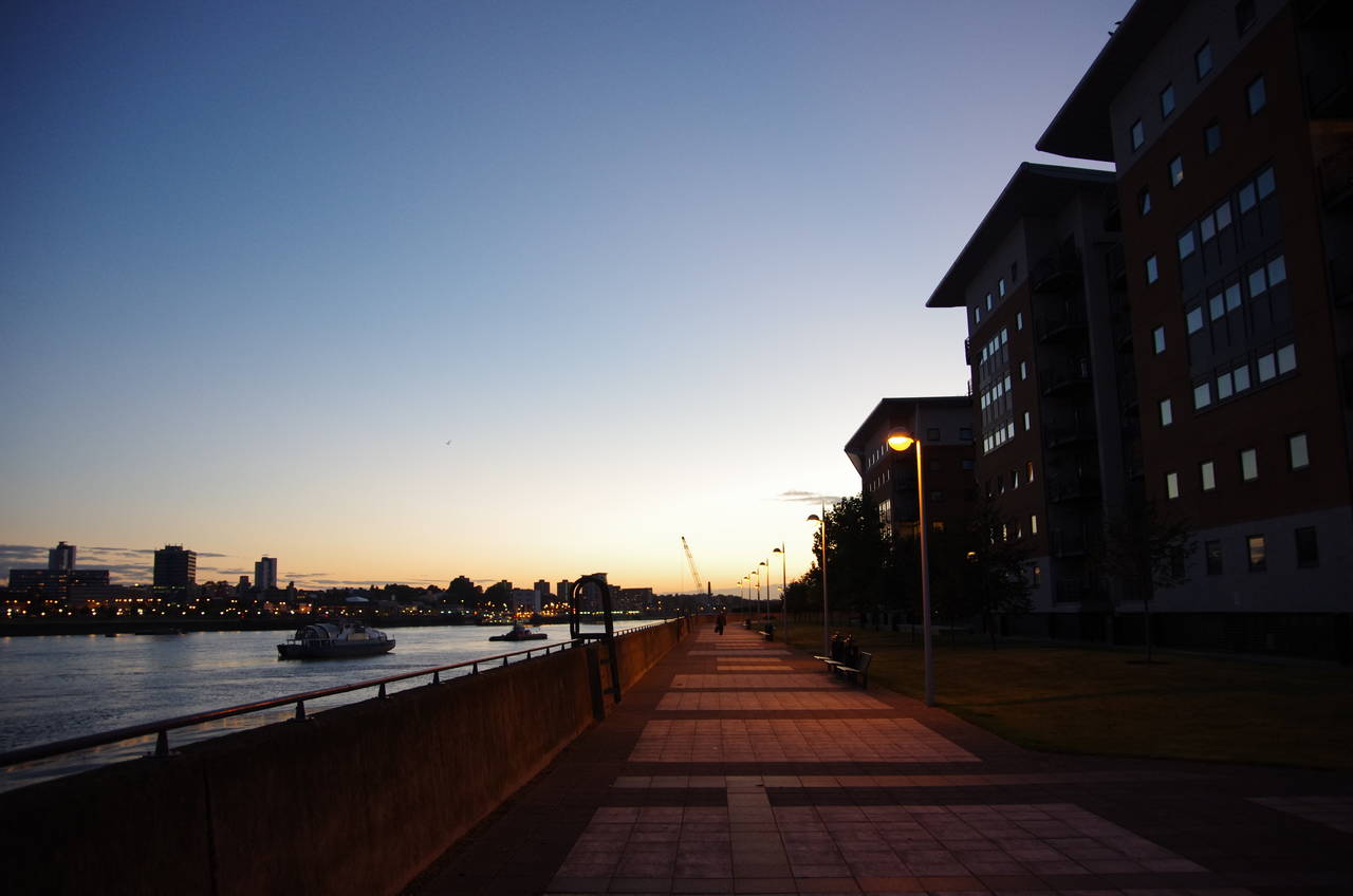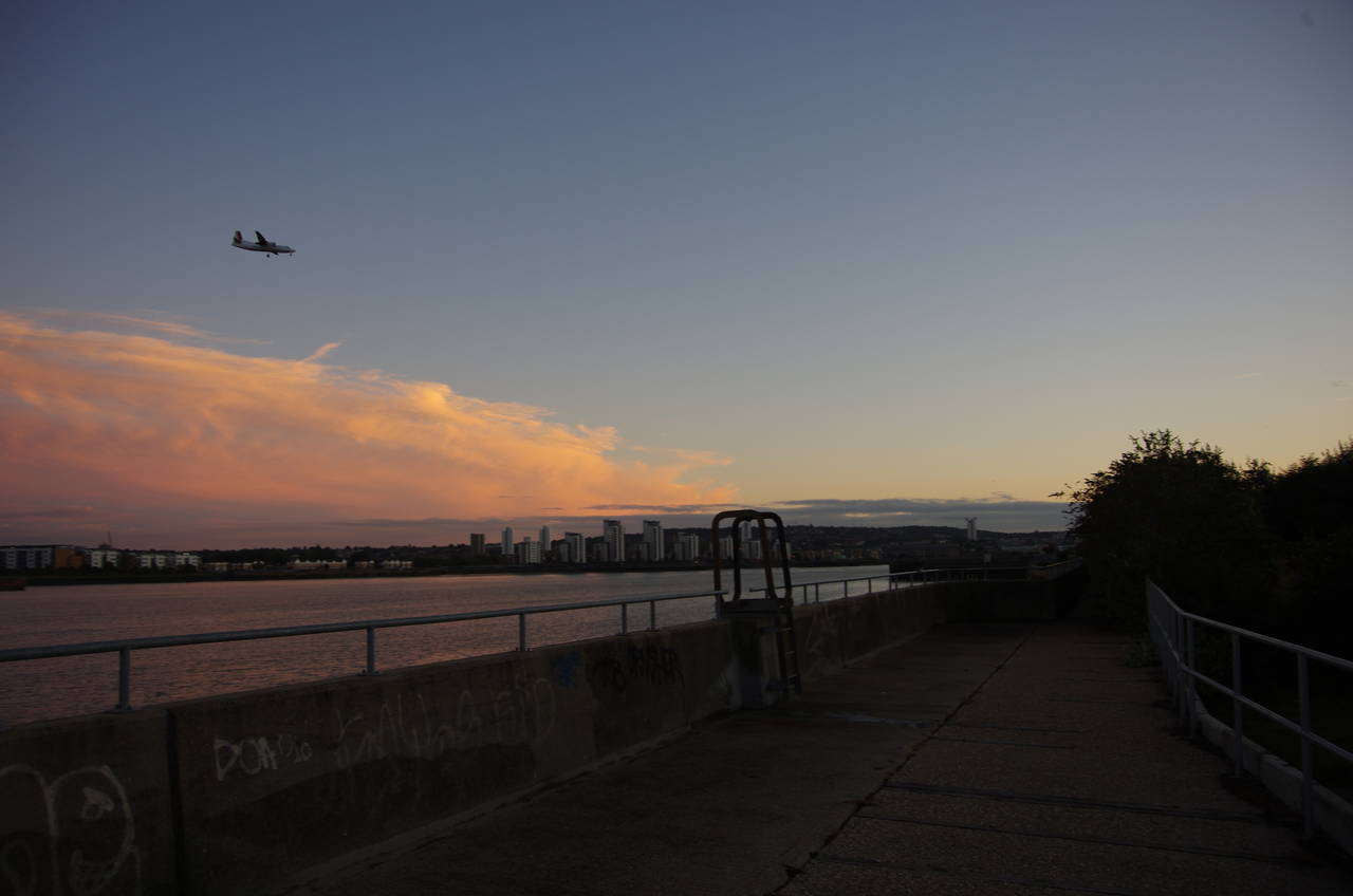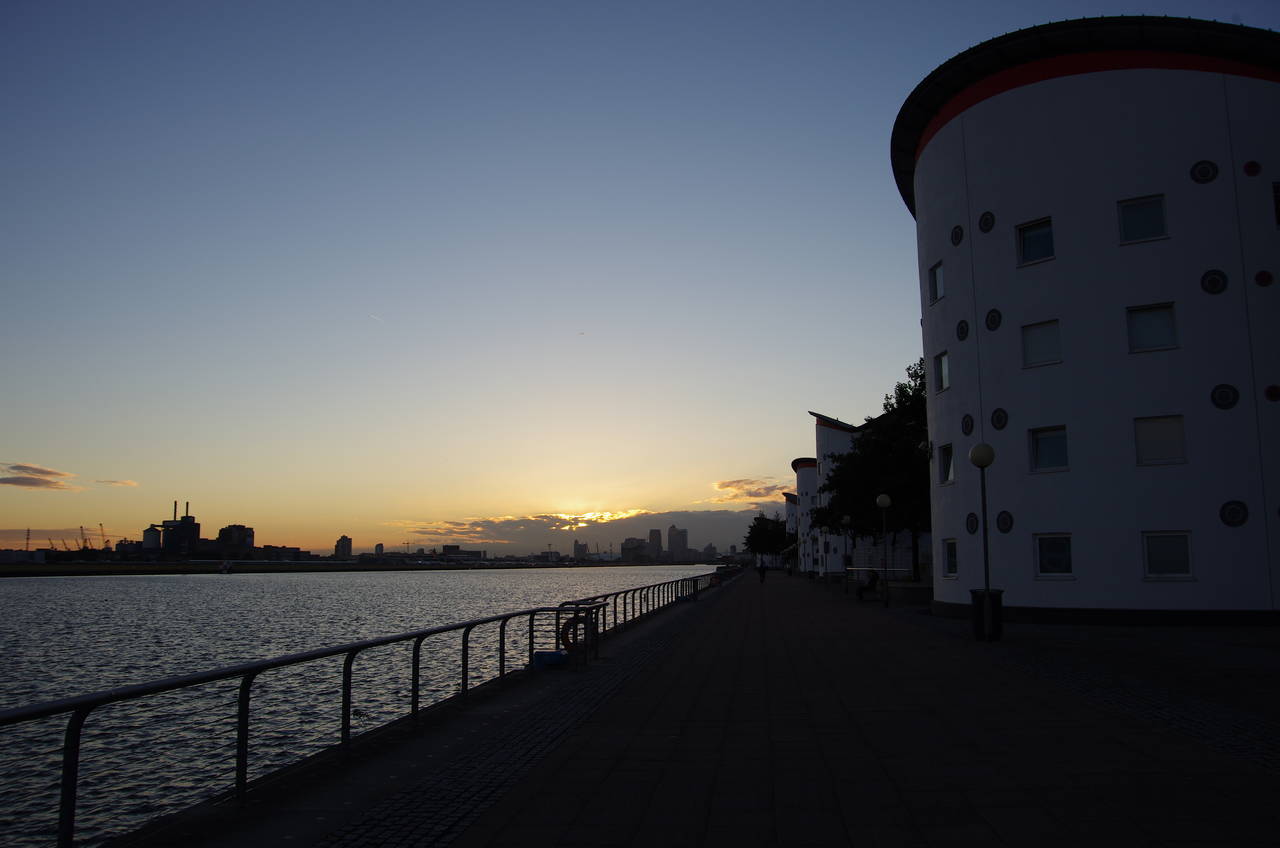 Fifty metres ahead from the entrance, the Capital Ring comes up to the edge of the vast Royal Albert Dock. Opened in 1880 and handling commercial shipping until 1982, the Royal Albert Dock is almost two kilometres long. Together with the nearby Royal Victoria and King George V docks, this was the largest dock complex in the world at the time it was opened. By the edge of the dock are a number of interesting cylindrical student apartment buildings (picture 38), while on the far side of the water the runway of the London City Airport (picture 39) separates the Royal Albert Dock from the parallel King George V Dock. Looking along the dock to the right, the Millenium Dome and the tower blocks of Canary Wharf seemed quite close.