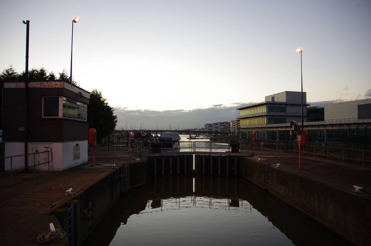 After following a road for about 100 metres, another ragged path leads to steps over the flood wall and between wire fences to the entrance lock of the King George V Dock, which has the same dimensions as the original lock of the Royal Albert Dock. Ships large enough to almost fill this lock don't actually use it any more, as they would not be able to pass under the road bridge that crosses over the far end of the lock.