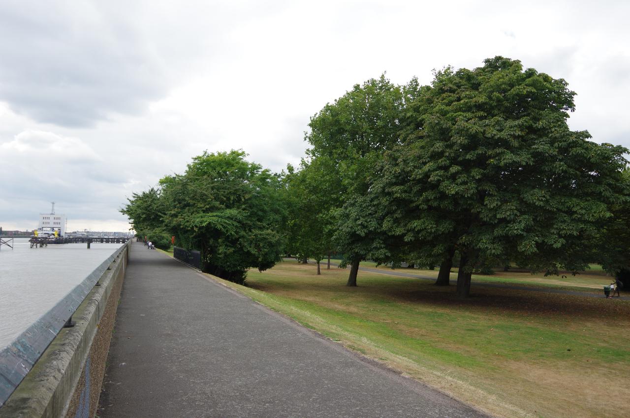 A short distance past the pavilion, the route turns left at a main signpost, following a footpath under a line of trees across the park. For the last few kilometres, I had been considering finishing the day's walk here as it was getting quite late in the afternoon. However, with my GPS showing just over an hour left until sunset and the signpost giving a distance of 3.5 miles (5.6 kilometres) to the Woolwich Foot Tunnel, I decided to press on and see if I could finish the walk before the daylight ran out.