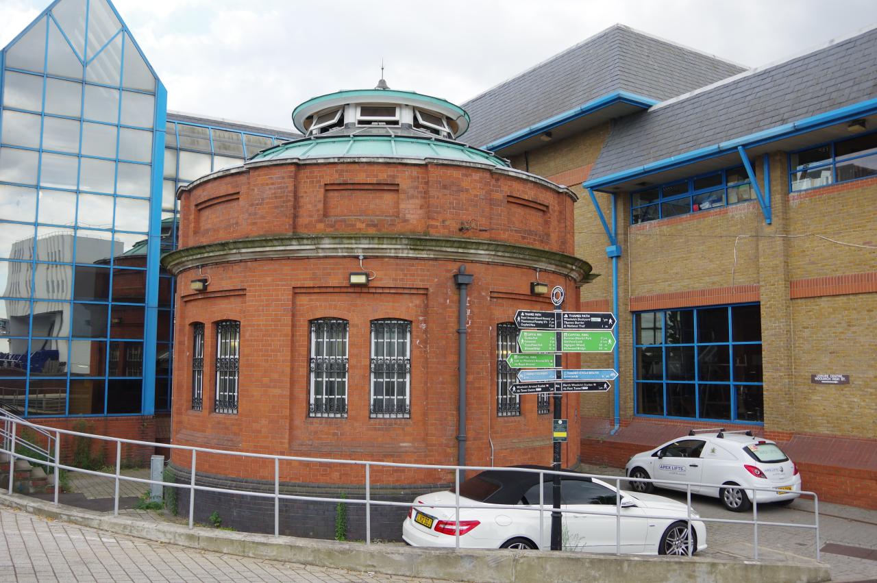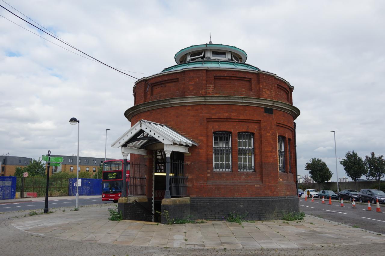 On the last day on August 2016 I returned to Woolwich, having learned that the Woolwich Foot Tunnel had reopened. I rode the DLR to King George V Station, then walked down to the Thames via the Royal Victoria Gardens (picture 45), from which it was a short walk westward along the riverside path to the entrance of the Woolwich Foot Tunnel (picture 46). Once I had descended the spiral staircase, the 504 metre tunnel (picture 47) was deserted aside from a couple of cyclists who zoomed by, evidently unable to comprehend the large and frequent "No Cycling" signs. After a few minutes I emerged on the south bank of the Thames, where the tunnel portal (picture 48) is surrounded on three sides by the Waterfront Leisure Centre. From there it is about ten minute's walk to Woolwich Arsenal Station.