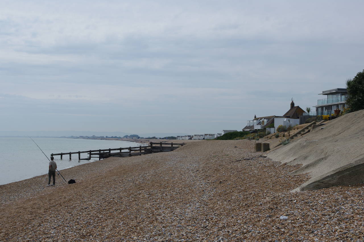 From this vantage point, there is no path above the beach, so I headed a short distance along Beaulieu Road to turn left into Cooden Road which I followed for about 300 metres to a roundabout by Cooden Beach. Before heading off along the beach, I first turned right for about 80 metres to the Cooden Beach railway station, where I acquired lunch at the attached convenience store. A short way along the beach, I sat down to eat my sandwiches and watched a local fisherman trying his luck in the calm water (picture 22).