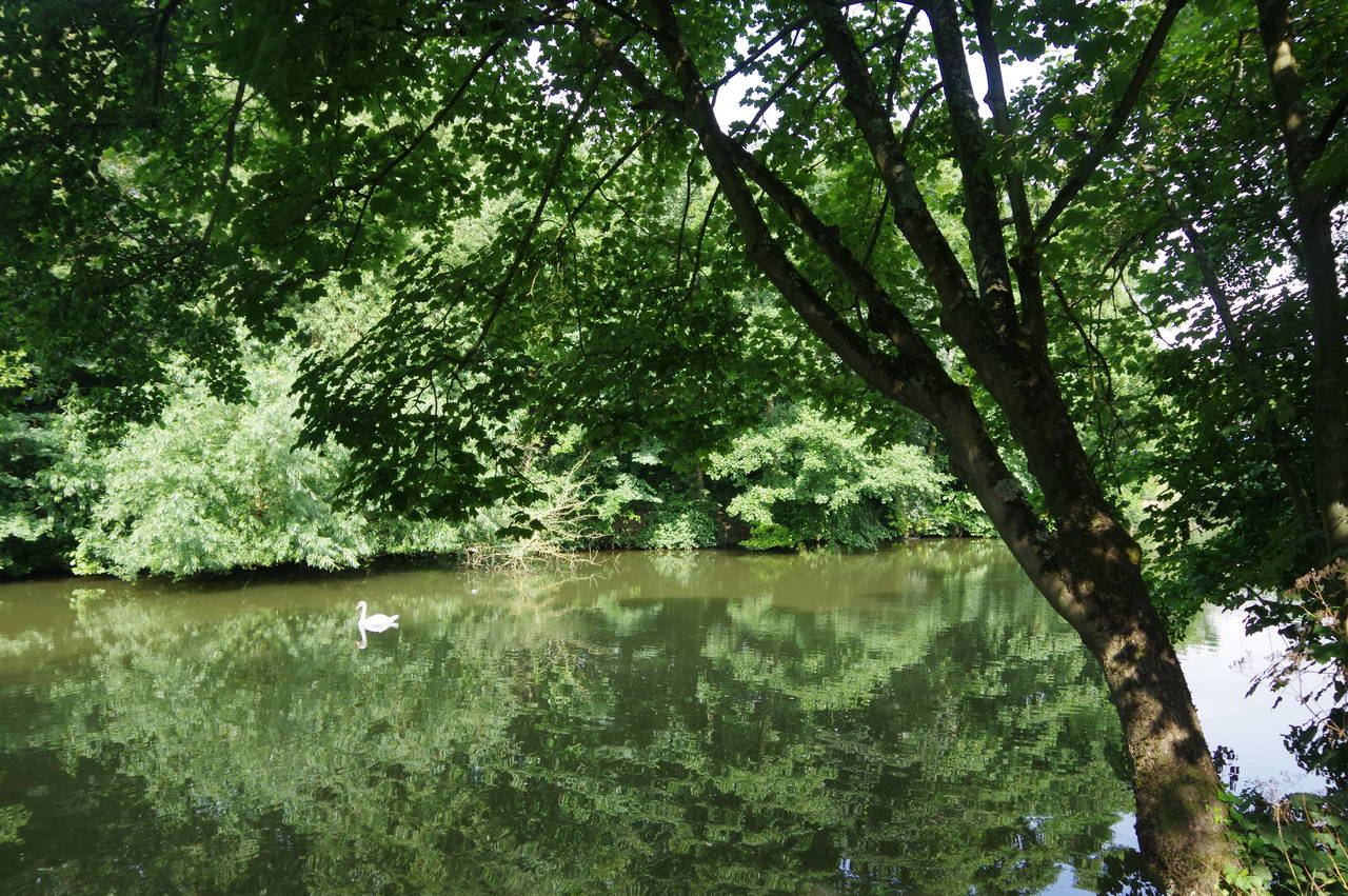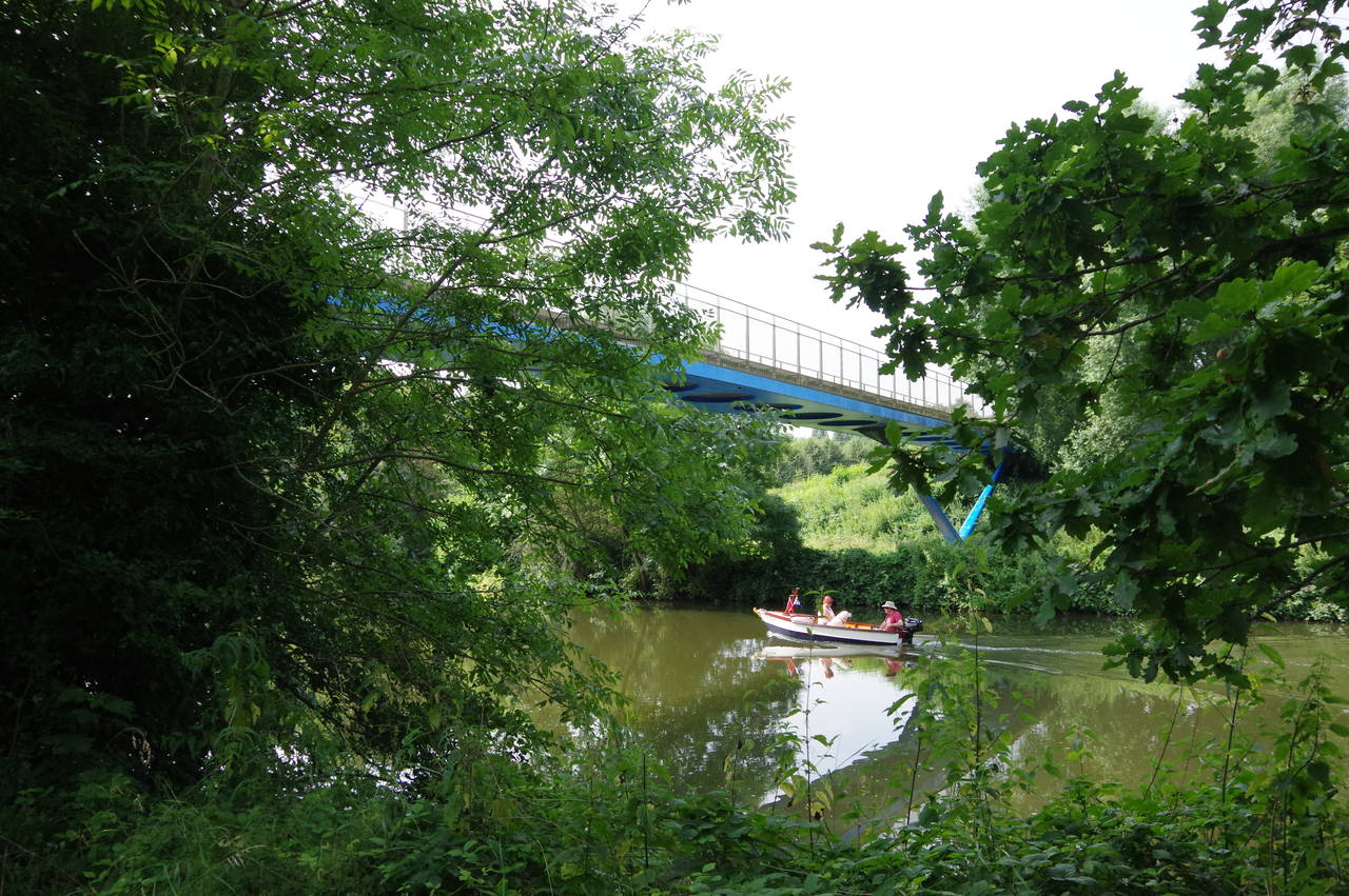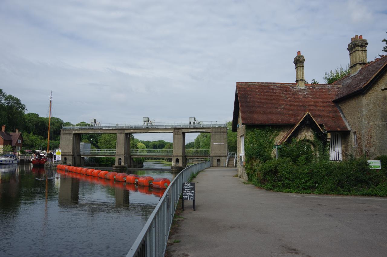 The route crosses the bridge, turning right to descend a ramp to the riverside path a short distance upstream from the bridge, then turning downstream to head under the bridge (picture 1) and then soon under the rather less attractive concrete A229 bridge.