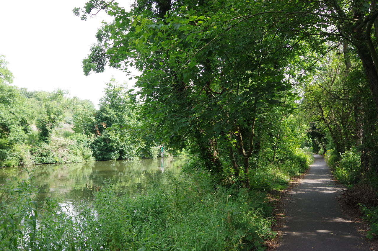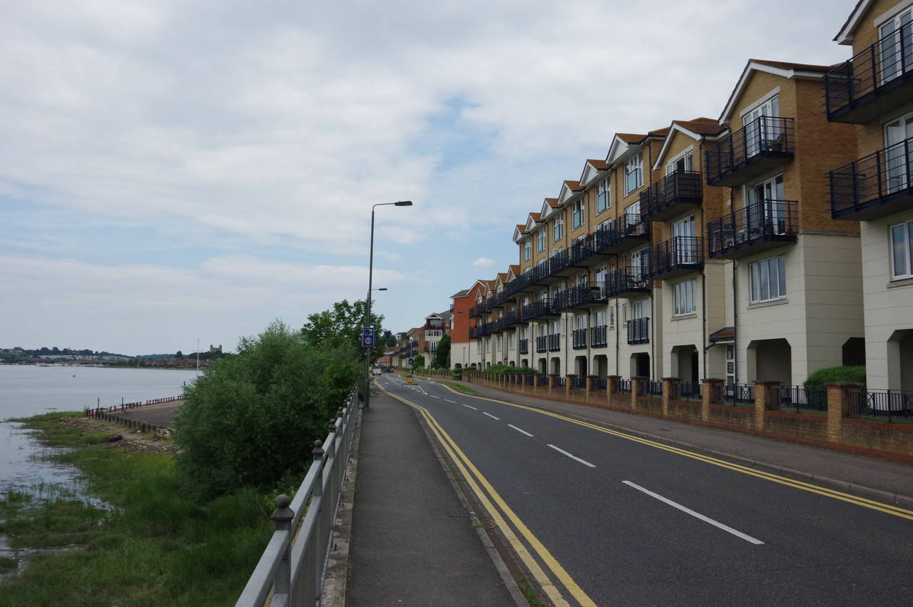 The Walk continues along the road as far as a Co-Op store, turning left down an untidy public footpath and heading downhill for almost 400 metres before turning right on an enclosed path to the entrance of the Medway Bridge Marina. Just ahead, a path enters the large Borstal Recreation Ground (picture 23), running along the middle of a strip of trees separating the playing fields and the Medway. At the far end of the recreation ground, the Walk joins the riverside Esplanade (picture 24), which is followed past a residential area until the riverside footpath forks off away from the road, passing some modern apartments before entering the pleasant Esplanade Park.