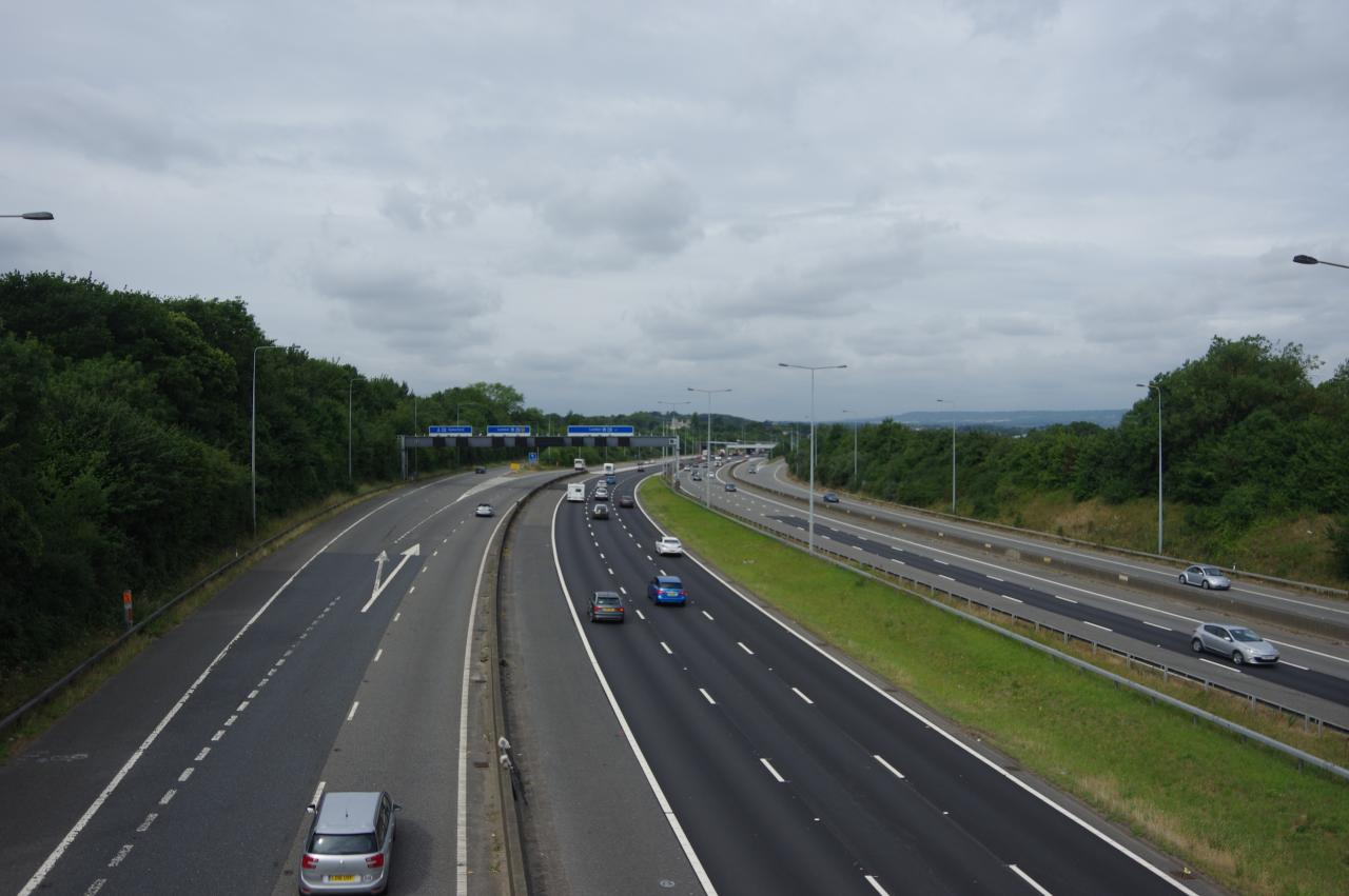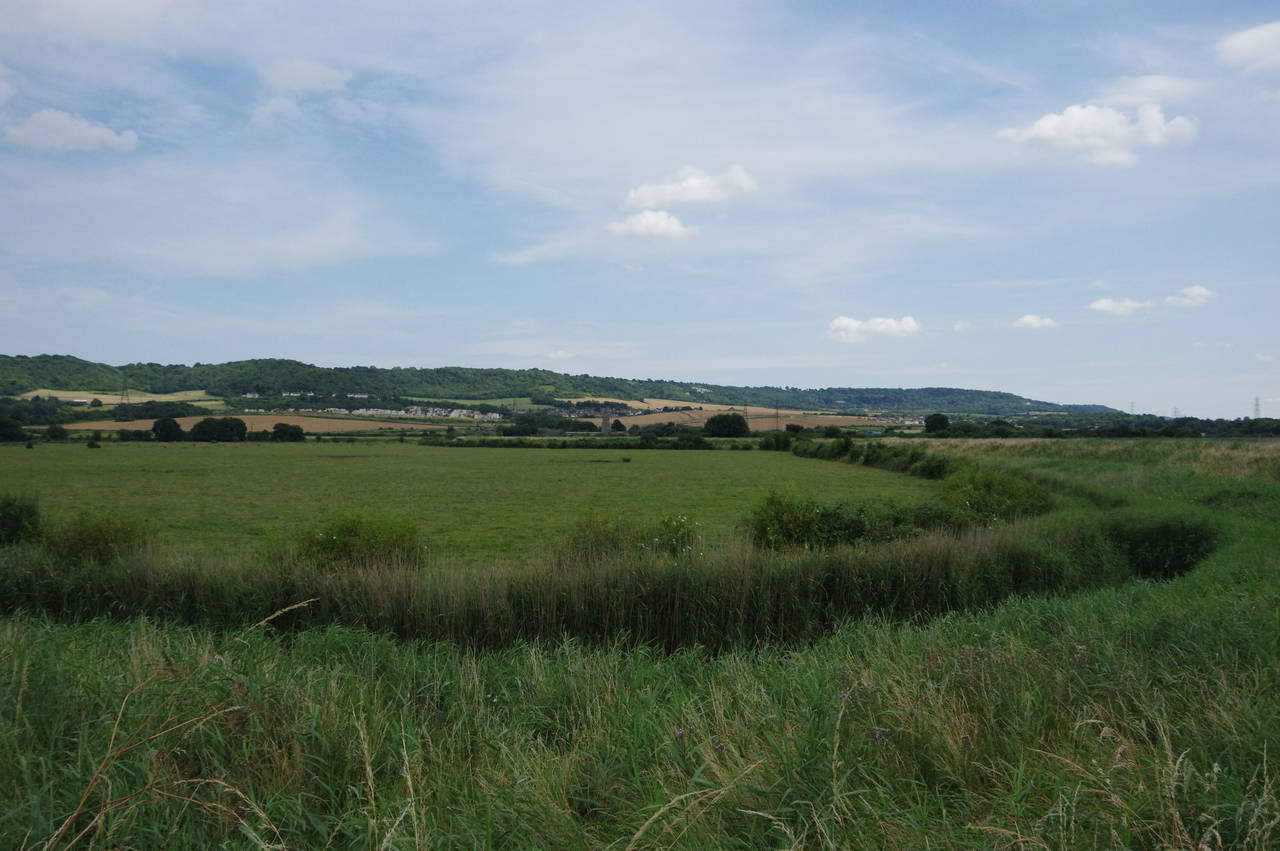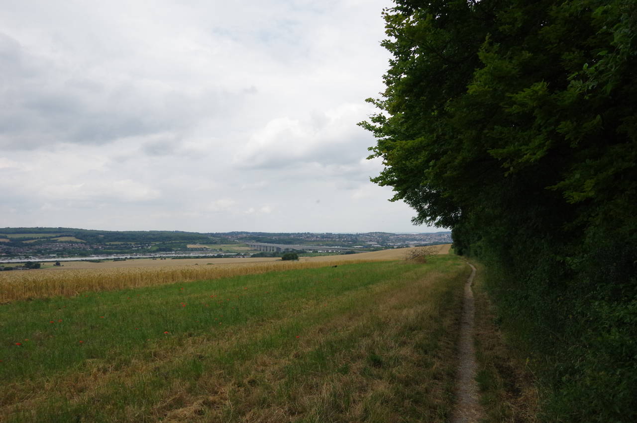 When the wood peters out, the trail begins to descend across Nashenden Down, joining a farm track that crosses a bridge over the Channel Tunnel railway and through Nashenden Farm to turn left along Nashenden Farm Lane, parallel with the M2. At the end of the lane the Walk turns right on Wouldham Road, passing under the M2 and then parting company with the North Downs Way, which turns off to head over the Medway Bridge.