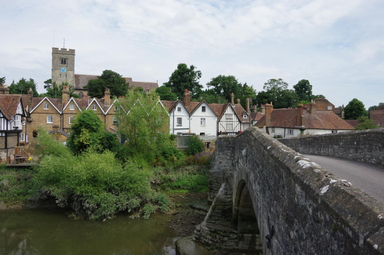 Soon passing some new riverside housing, the Walk reaches a concrete road bridge that crosses the river in the village of Aylesford, blocking the riverside path. The Walk turns uphill beside the bridge, briefly joining Station Road before taking the first turn on the right to cross the village's much more attractive medieval bridge (picture 9) to reach the High Street.
