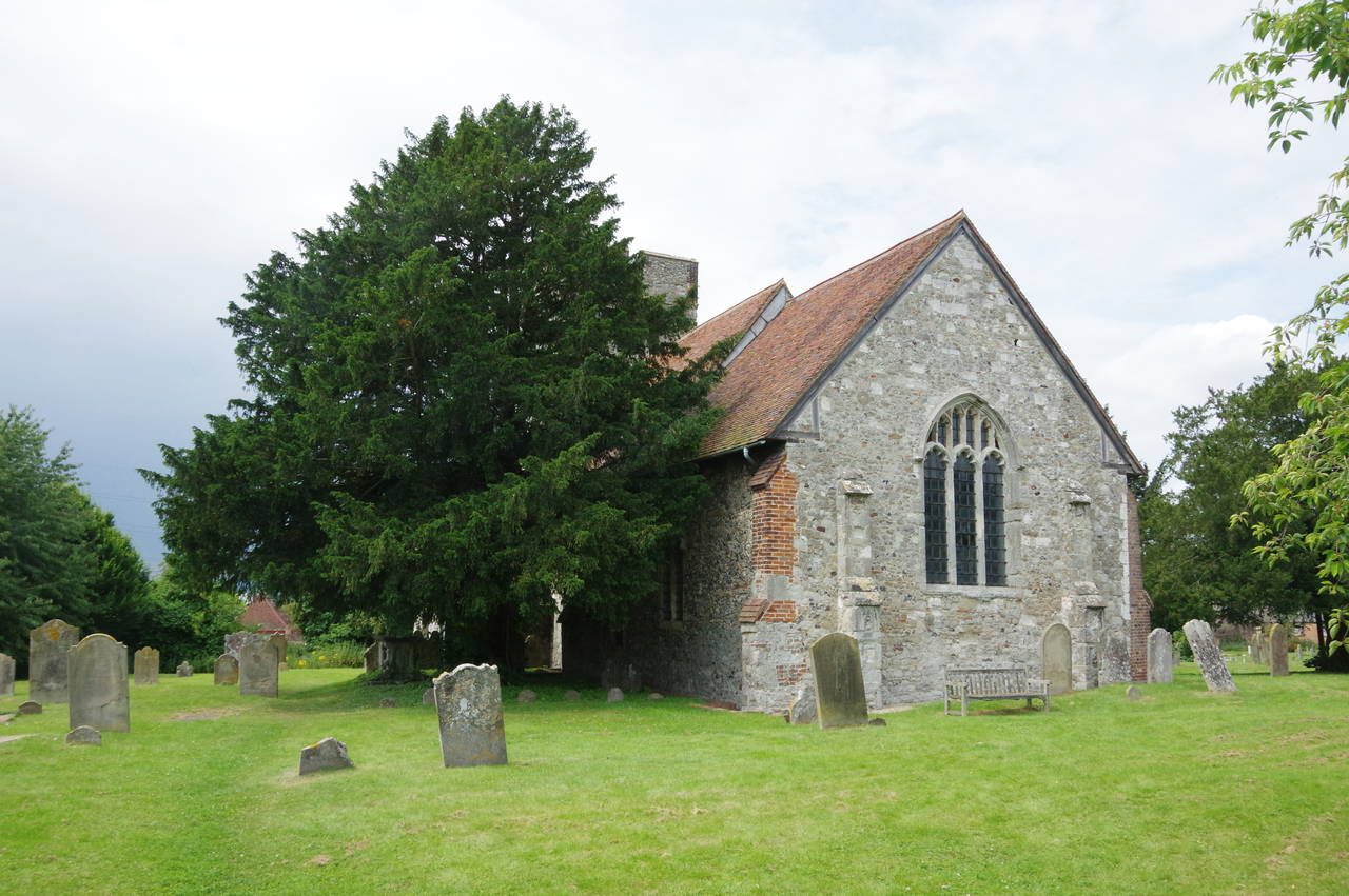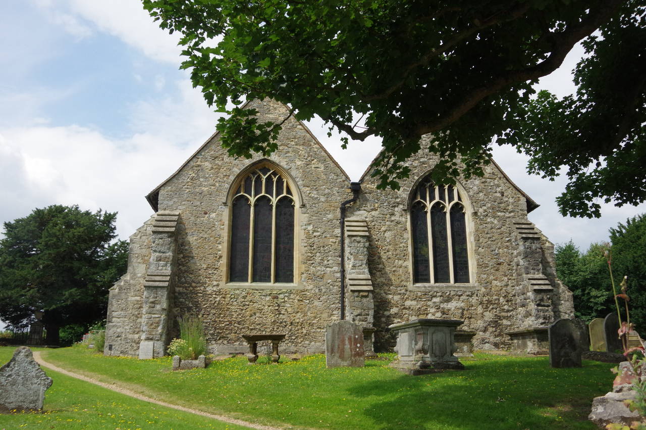 The route turns right, along the High Street, then turns left at the next intersection to climb Vicarage Close for about fifty metres to turn left again on Church Walk, below the parish church of St Peter and St Paul (picture 10). Church Walk runs across the hillside, below the churchyard and above the buildings of the High Street, eventually heading down a long ramp to rejoin the High Street, heading westward out of the village.