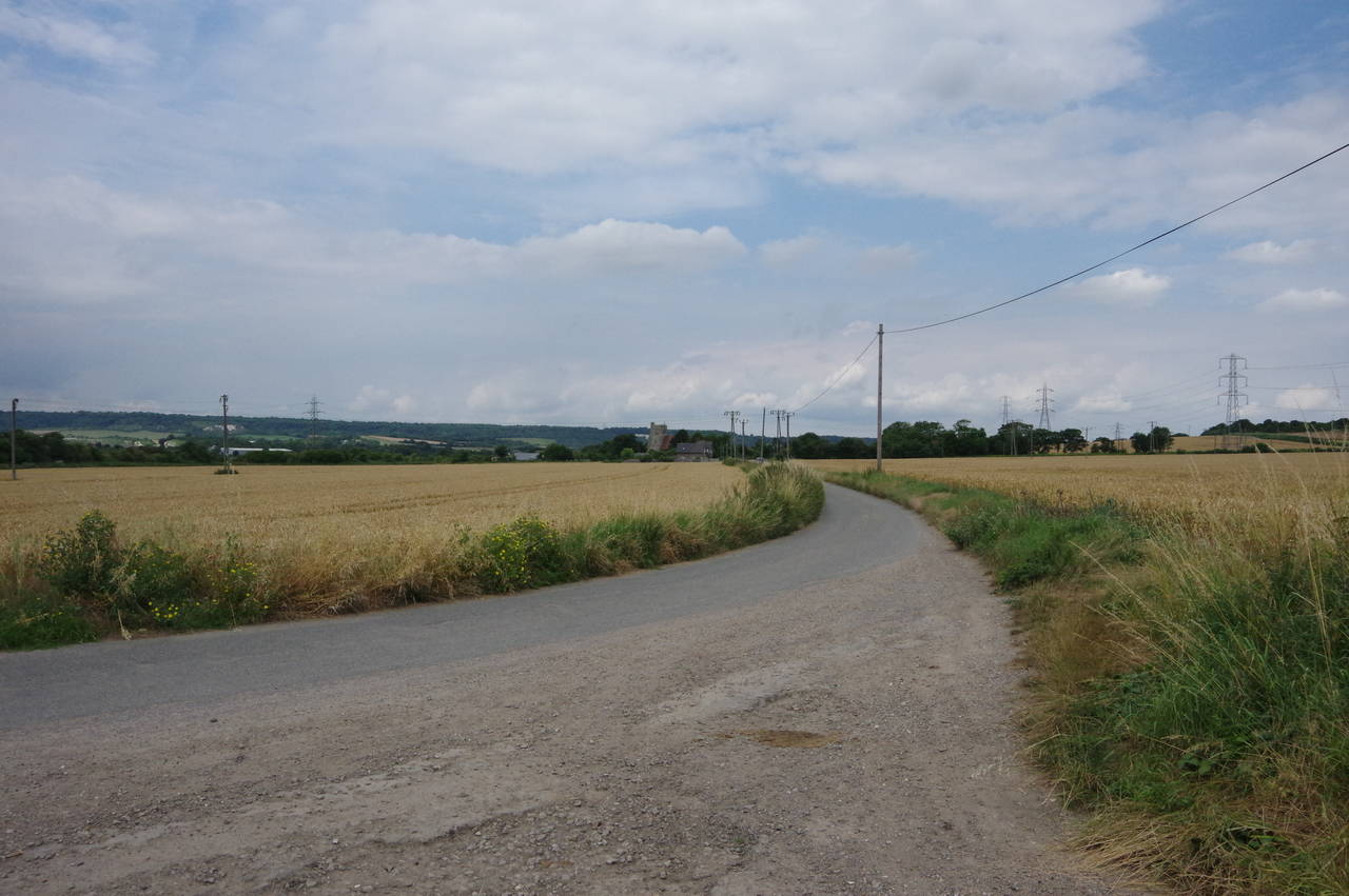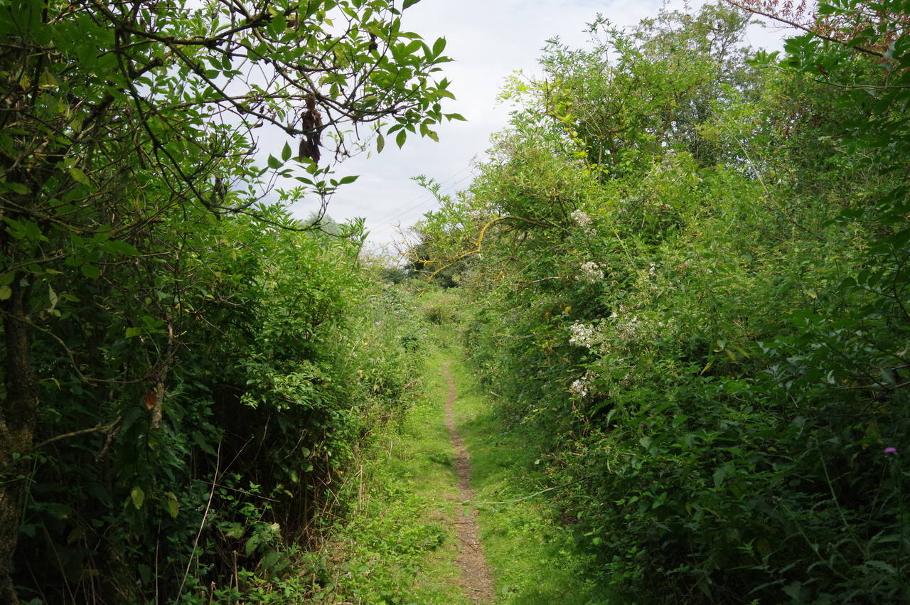 The road soon bends left to head northwards through Bushey Wood (picture 13). After a kilometre, the lane is blocked by a metal gate. Just before the gate is a driveway on the left, where the official route cuts through a patch of scrub to cross a field for about 300 metres to rejoin the road at a bend (picture 14). However, the path into the field wasn't signposted and was very overgrown, so I presume that most walkers heading in my direction just climb over the gate and keep walking along the lane. I was only able to identify the correct route by carefully examining my Ordnance Survey map.
