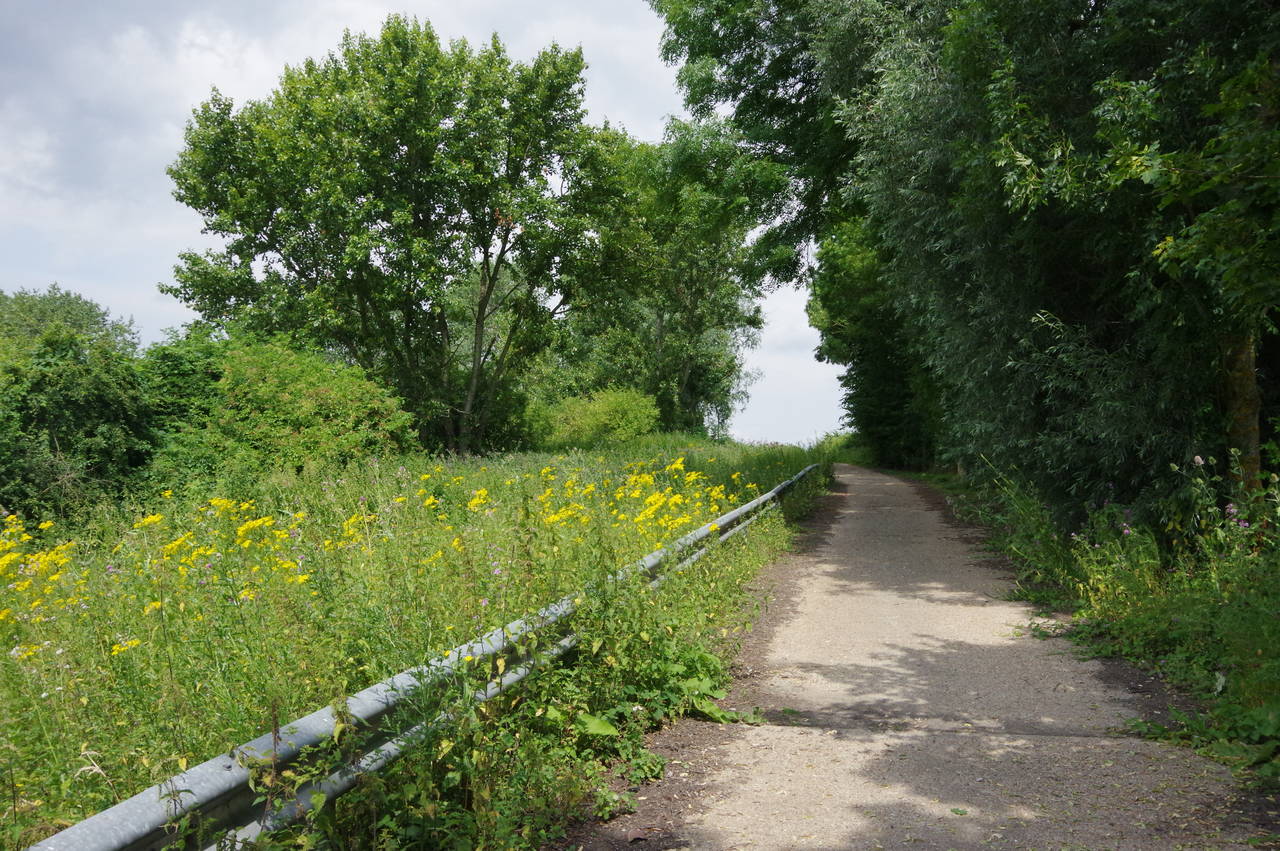 At the end of the footbridge, the Walk turns left through trees, soon emerging into a large field. The route skirts around the right-hand edge of the field to the end of the trees then continues ahead to a small copse where the path runs just inside the right-hand edge before turning right along the fence of an industrial area and then left on a narrow enclosed path alongside the Medway Valley Line. After about 200 metres the path reaches the end of Coldharbour Lane and turns right across the tracks to return to the tree-lined left bank of the Medway.