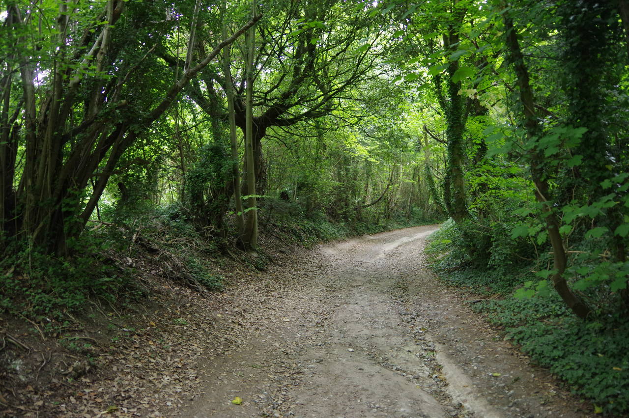 The Walk follows the High Street northwards through Wouldham, turning right into School Lane just before the end of the village. The lane climbs gently towards the North Downs, passing the All Saints School before leaving the village. After almost a kilometre the lane reaches an intersection with Pilgrims Way, crossing over and climbing through woods on an unsealed track called Hill Road (picture 20).