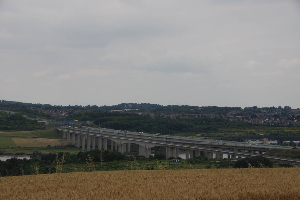 At the top of Hill Road, the Walk reaches a junction with the North Downs Way National Trail, which I walked back in the summer of 2010. Turning left along the North Downs Way, the Walk emerges in the open at the top of a large field, following the well-worn trail along the edge of Shoulder of Mutton Wood with good views across the Medway Valley (picture 21). The view is dominated by the Medway Bridges (picture 22), which carry the M2 and the Channel Tunnel railway line over the river.