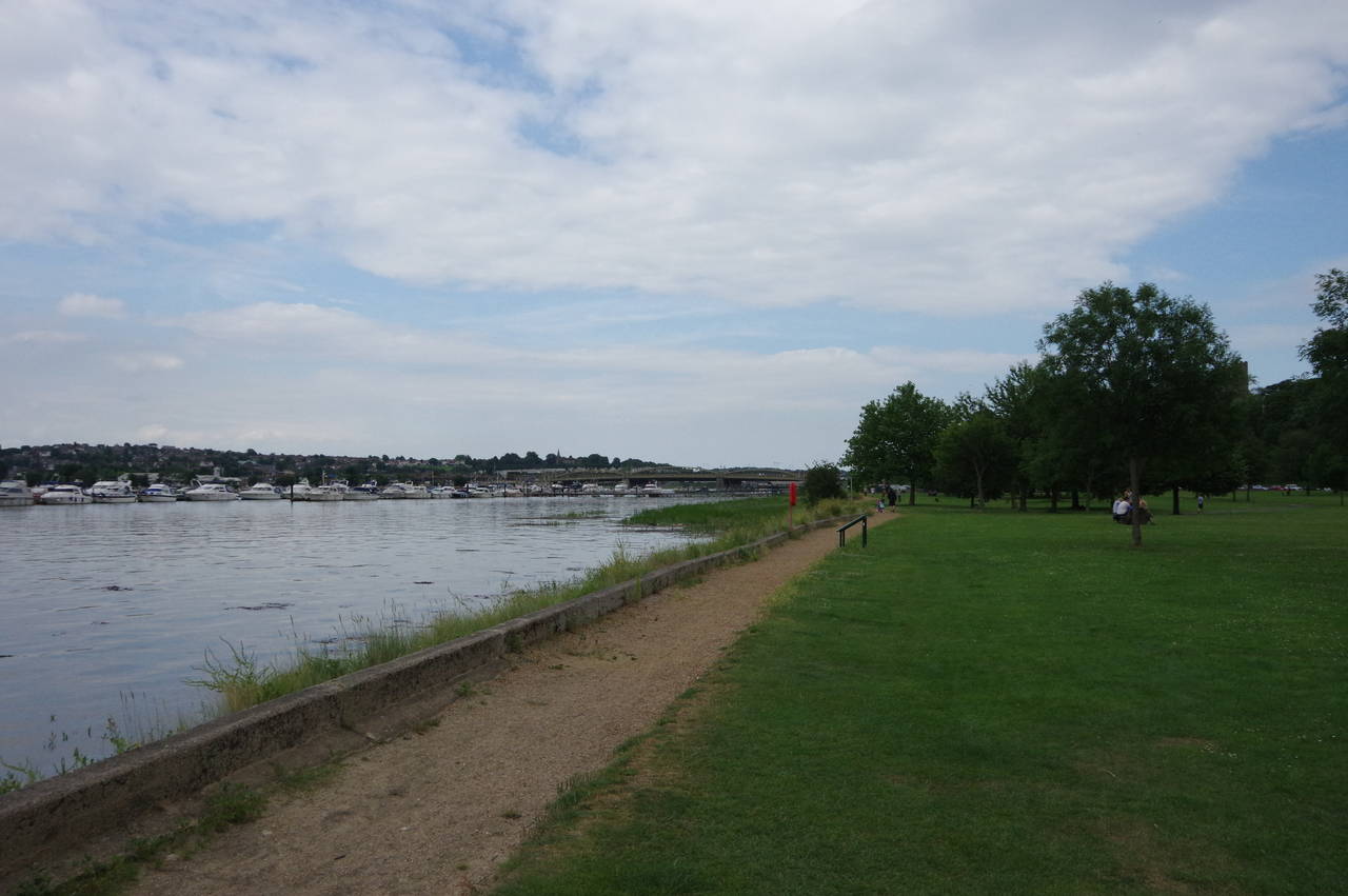 The path runs along the edge of the park (picture 25), past the clubhouse and jetty of the Rochester Cruising Club, and into a more manicured section of the park, overlooked by the imposing curtain wall and towering keep of Rochester Castle (picture 26), the tallest castle keep in England at 34 metres.