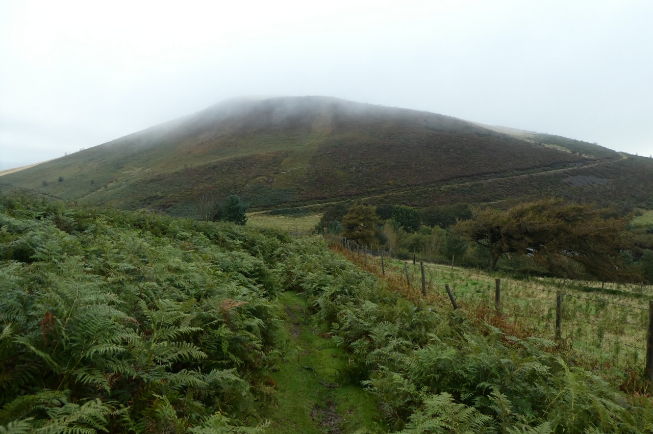 Somewhat inexplicably, Offa's Dyke Path doesn't quite follow the track all the way up to the ridge, instead turning left over a waymarked stile on the left about fifty metres short of the crest and following a narrow groove through the dense gorse toward a fingerpost about 150 metres from the stile. At the finger post the Path merges into a grassy trail that sets off across the bracken-covered western face of Moel Gyw.