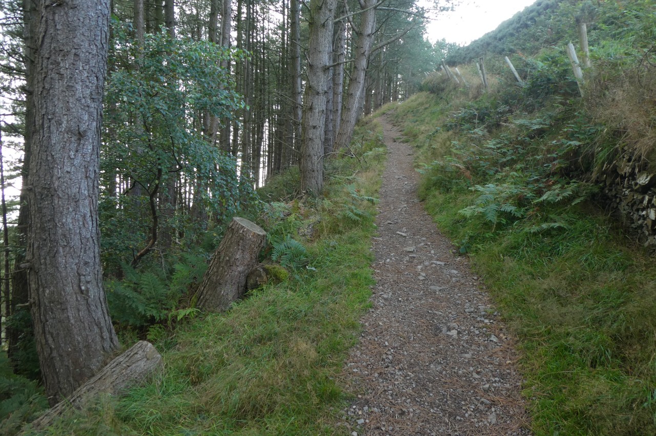 Turning right along the road, the Path soon branches left to reach a Forestry Commission of Wales carpark on the edge of their Coed Llangwyfan plantation, re-entering Denbighshire. Between a pair of information panels at the back of the carpark, a gate bearing the familiar National Trail acorn symbol indicates the beginning of a steady climb up through the edge of the forestry plantation (picture 31), staying just on the Denbighshire side of the wall. (The OS map incorrectly shows the route on the Flintshire side of the wall.)