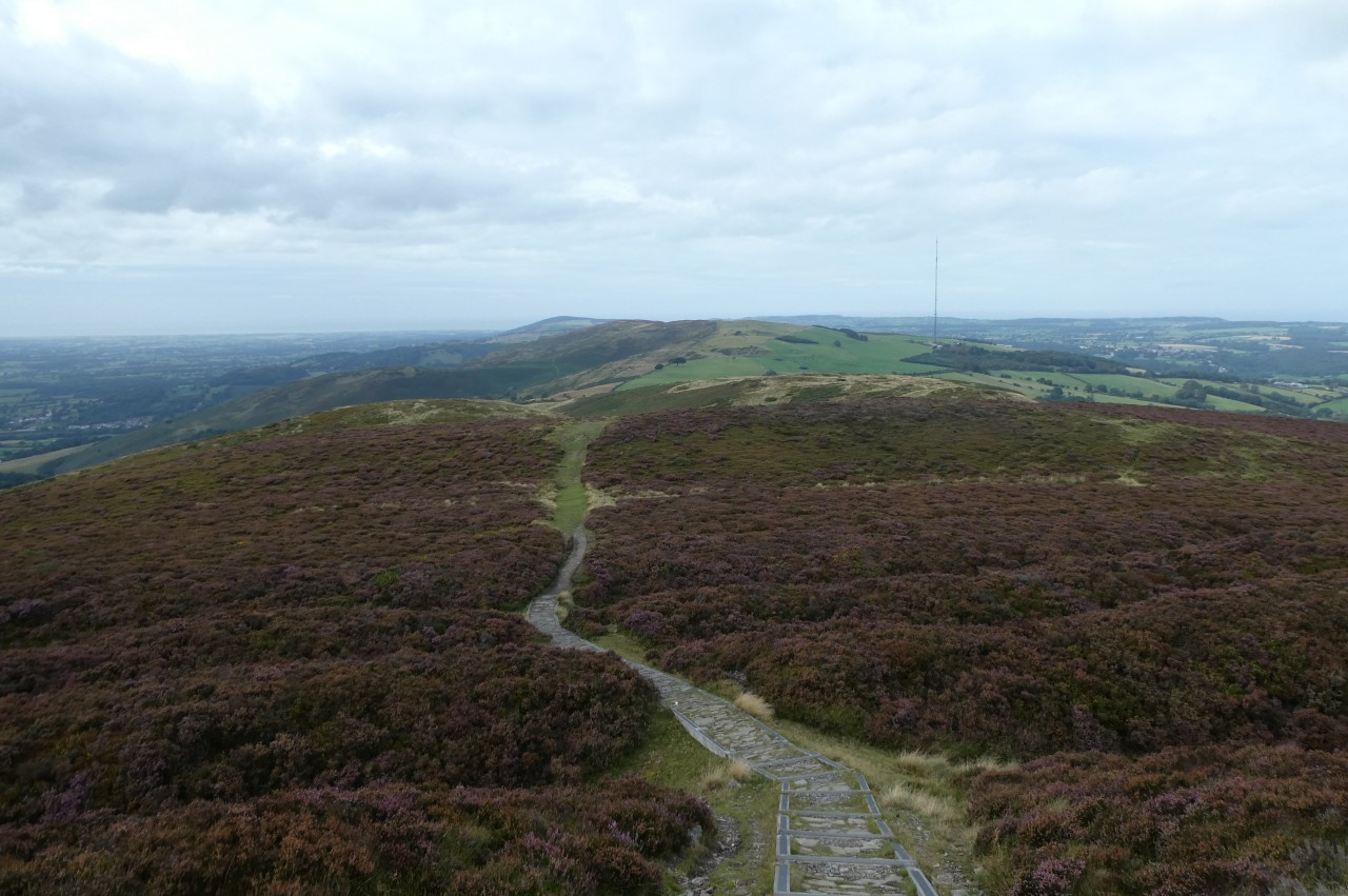 On the other side of the carpark, an information panel gives the history of the hillfort and a fingerpost points up a narrow footpath that climbs over the heathery eastern shoulder of the hill. The Offa's Dyke Path doesn't go up to the hillfort, but over on the north-eastern side of the hill the Path passes an upright stone slab that marks the beginning of another path that does go up to the fort. From that point, reaching the summit only requires a diversion of about three hundred metres each way and forty metres elevation.