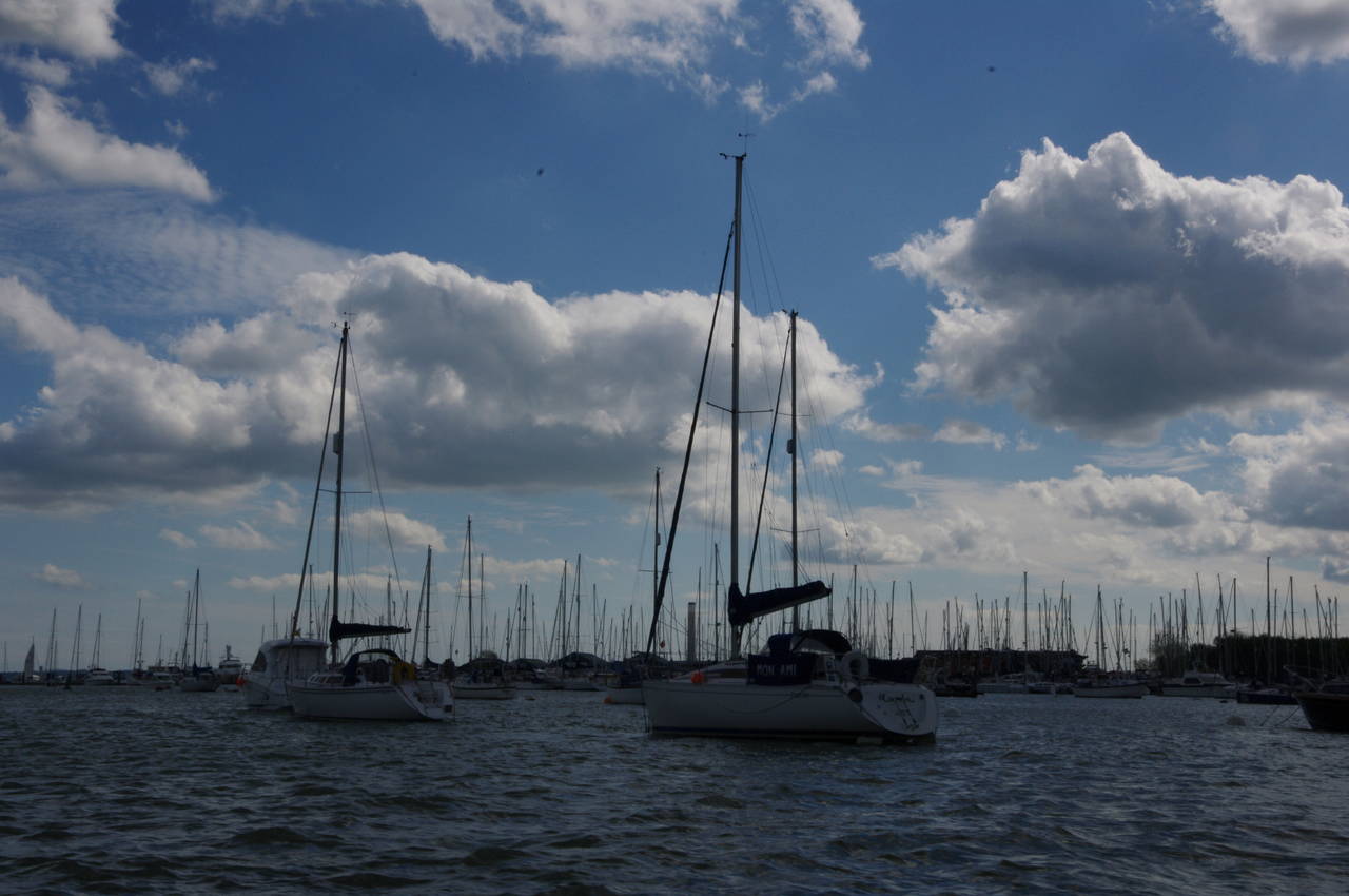 The Way follows Shore Road for a short distance beyond the pub before joining a footpath along the riverbank for about two hundred metres to reach the pier of the Hamble Ferry. The small ferry (picture 35) makes the leisurely five hundred metre journey across the river, weaving its way among the hundreds of boats moored on the river (picture 36) to the quayside at Hamble-le-Rice.