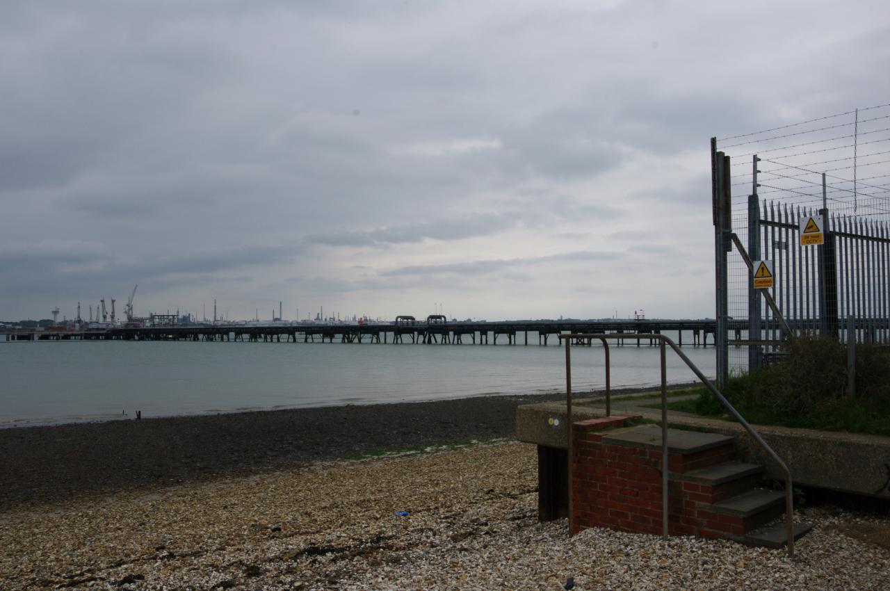 Turning right to follow the shingle shoreline, the path soon takes a brief diversion into the woodland of the Common before returning to the shore again and taking a narrow concrete path along the perimeter fence of a BP oil terminal. Along the way, the path passes under a pier that stretches more than four hundred metres out into the deeper part of Southampton Water (picture 38) to allow large tankers to use the terminal.