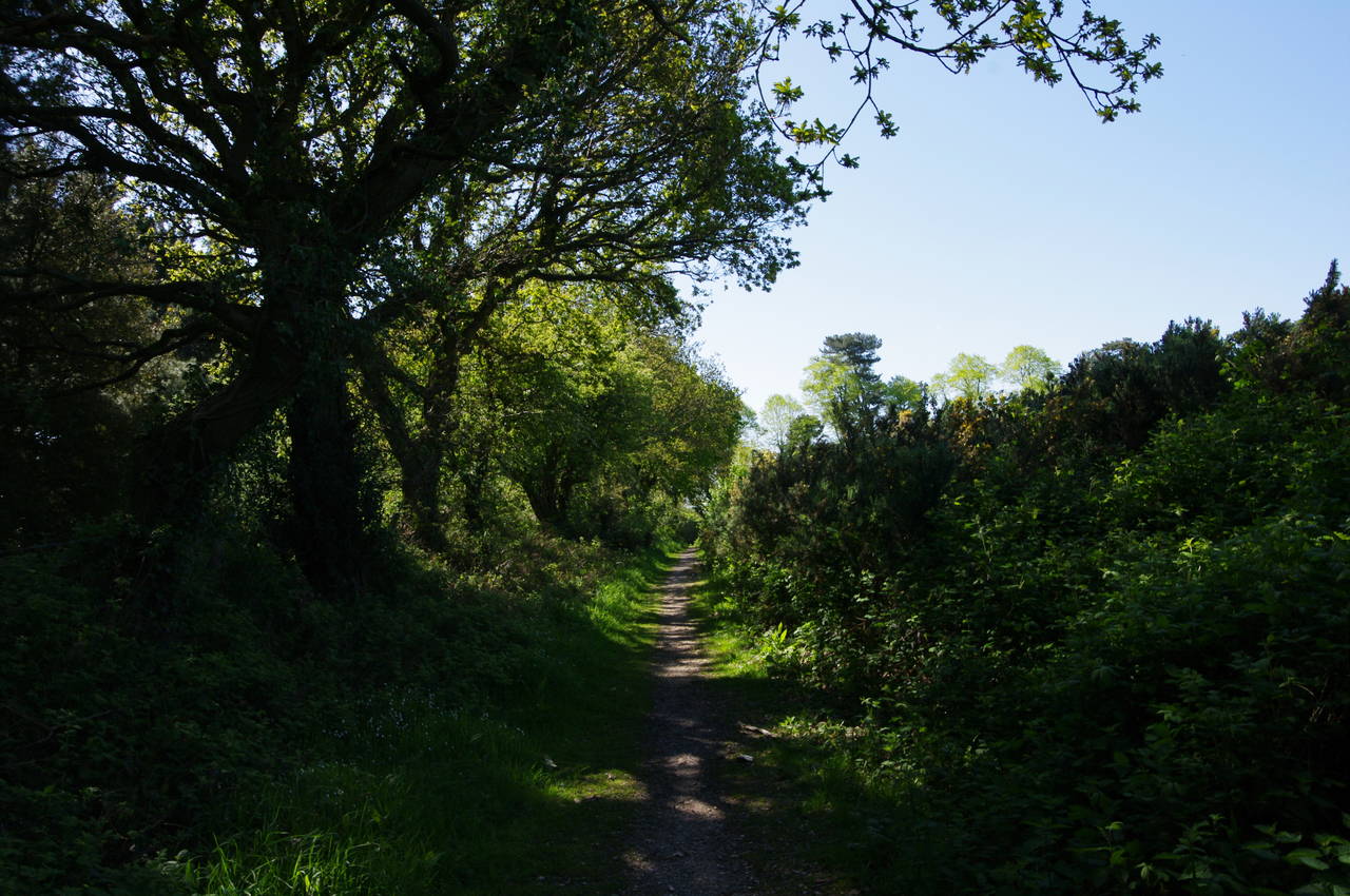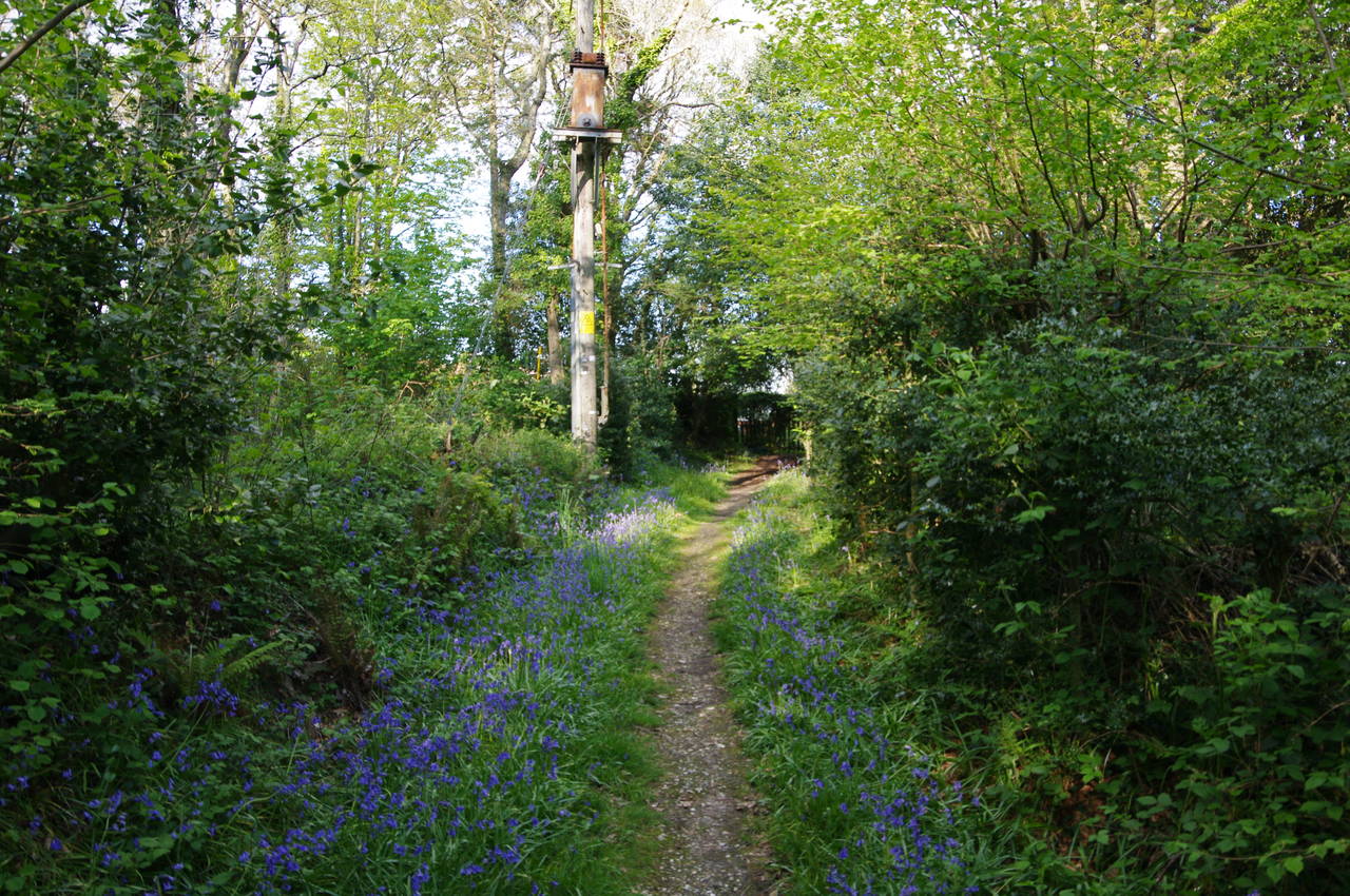 On the far side of the airstrip, the Solent Way passes the buildings of Snooks Farm then follows Snooks Lane a short distance to the left to find a wooden gate on the right that leads into Walhampton Wood. The path through the wood was lined with bluebells (picture 31), which flower for a few weeks in May.