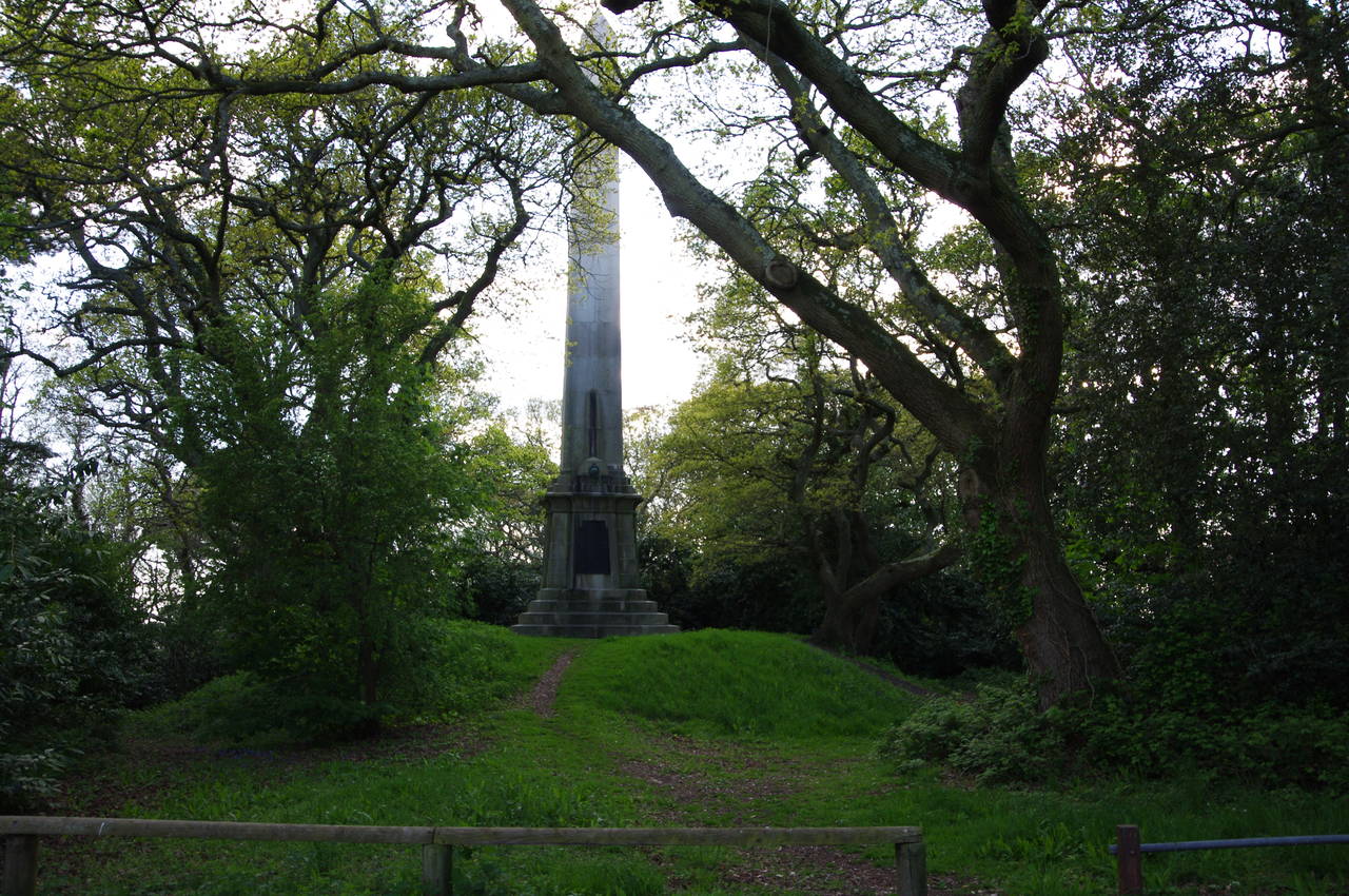 When the path emerges from the wood it runs along the edge of the Walhampton Golf Club and then along a farm driveway to reach Monument Lane, where the route turns right. When the lane bends to the right around the corner of the golf course, the Solent Way turns left through trees to pass a tall obelisk commemorating Admiral Sir Harry Burrard Neale, a 19th century member of parliament (picture 32).
