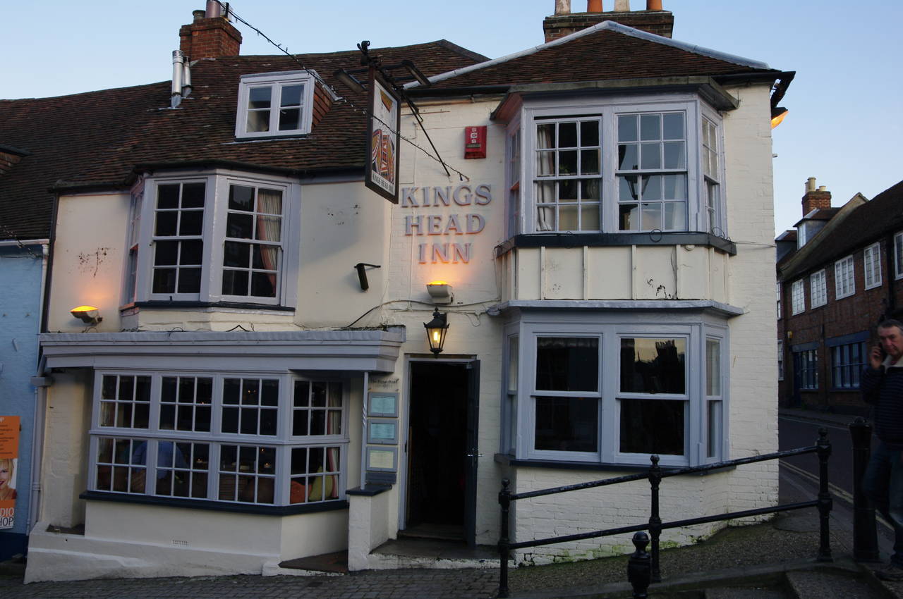 At a small roundabout, the route turns left to follow Gosport Road through the town to the foot of the High Street. Here the Solent Way turns left down the cobbled Quay Hill, which descends past the King's Head Inn (picture 34) and between touristy shops to the Town Quay. I decided that the pub was a good place to end the day's walk, having covered 27.7 kilometres.