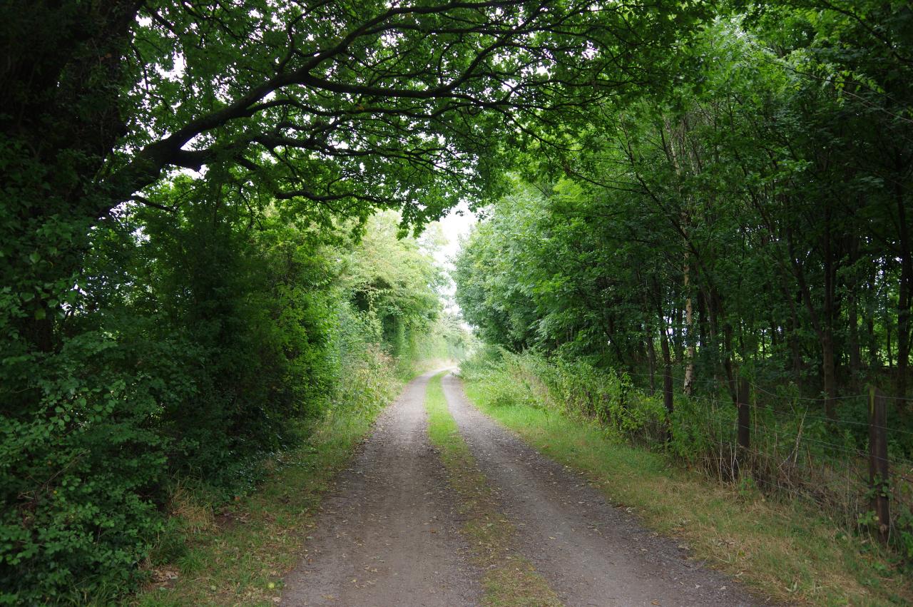 Before long a blue National Cycle Network sign on the right points the way along a quiet permissive path (picture 30) and after a couple of minutes the route reaches a fork and bears left to rejoin the trackbed, now travelling in a north-easterly direction.